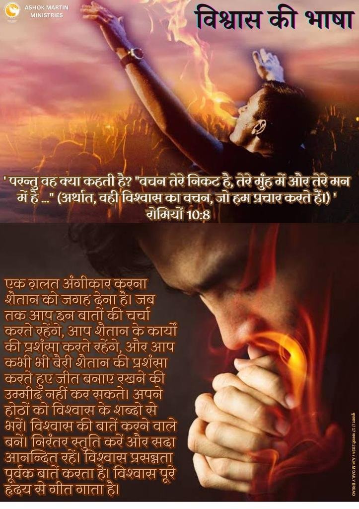 अपने होठों को विश्वास के शब्दो से भरें। विश्वास की बातें करने वाले बनें। विलाप न करें। निरंतर स्तुति करें और सदा आनन्दित रहें। विश्वास प्रसन्नता पूर्वक बातें करता है। विश्वास पूरे हृदय से गीत गाता है। विश्वास भरोसे के साथ प्रार्थना करता है।
