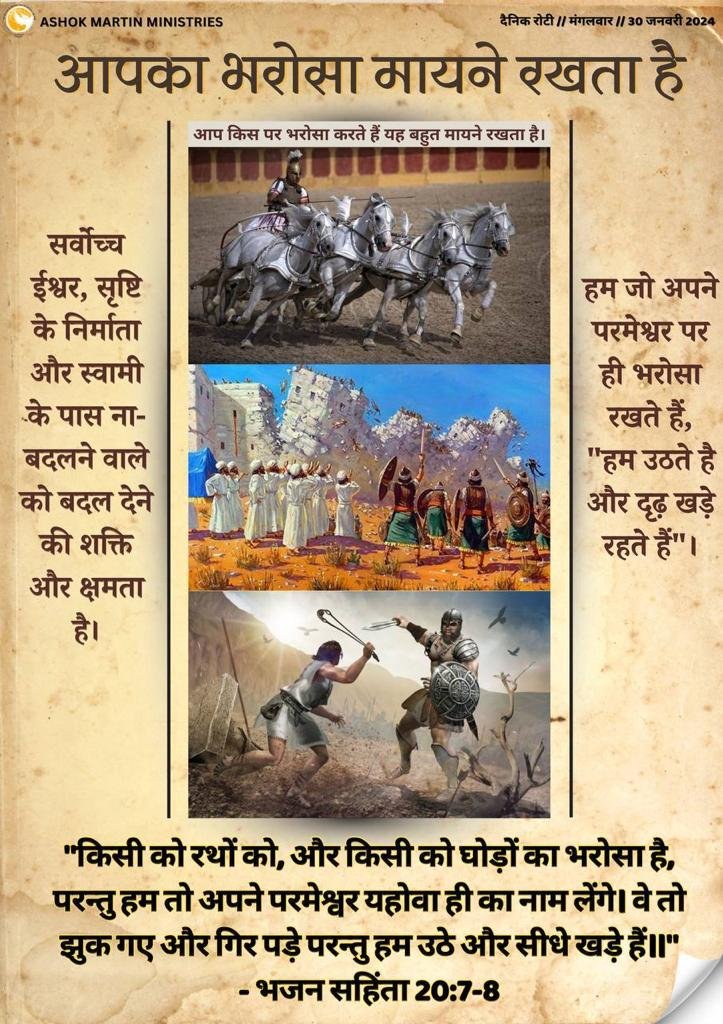 “किसी को रथों को, और किसी को घोड़ों का भरोसा है, परन्तु हम तो अपने परमेश्वर यहोवा ही का नाम लेंगे। वे तो झुक गए और गिर पड़े परन्तु हम उठे और सीधे खड़े हैं॥” – भजन सहिंता 20:7-8