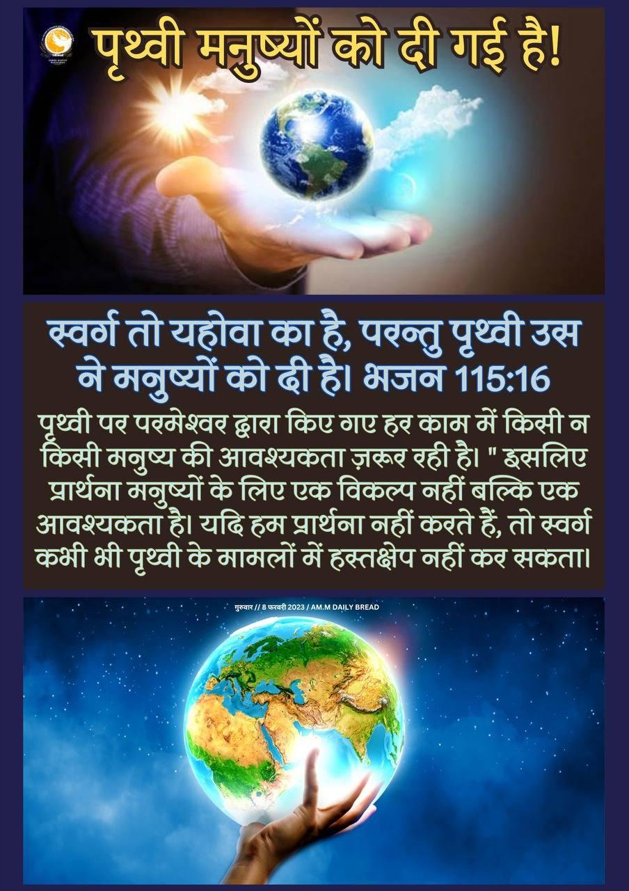 जॉन वेस्ले ने एक बार कहा था, “परमेश्वर प्रार्थना के उत्तर के अलावा कुछ नहीं करता है।” इसलिए प्रार्थना मनुष्यों के लिए एक विकल्प नहीं बल्कि एक आवश्यकता है। यदि हम प्रार्थना नहीं करते हैं, तो स्वर्ग कभी भी पृथ्वी के मामलों में हस्तक्षेप नहीं कर सकता। यह जरूरी है कि हम पृथ्वी की जिम्मेदारी लें और अपने प्रार्थना जीवन से यह सुनिश्चित करें कि पृथ्वी पर क्या क्या घटित होगा?