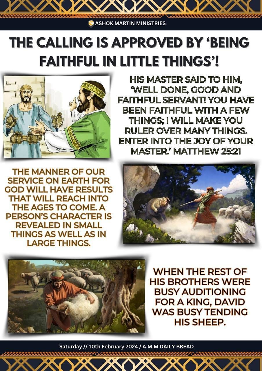 David was the youngest and the most ignored son in his father’s house. When the rest of his brothers were busy auditioning for a King, David was busy tending his sheep. He was too young to hold the risky profession of a shepherd. But David was faithful in his work. There were many reasons to do this work with a sorrowful and a burdened heart, but David cheerfully handled it. God saw how faithful David was and God made him ruler of Israel. Nothing else qualified David to be a King- but his faithfulness in small matters.