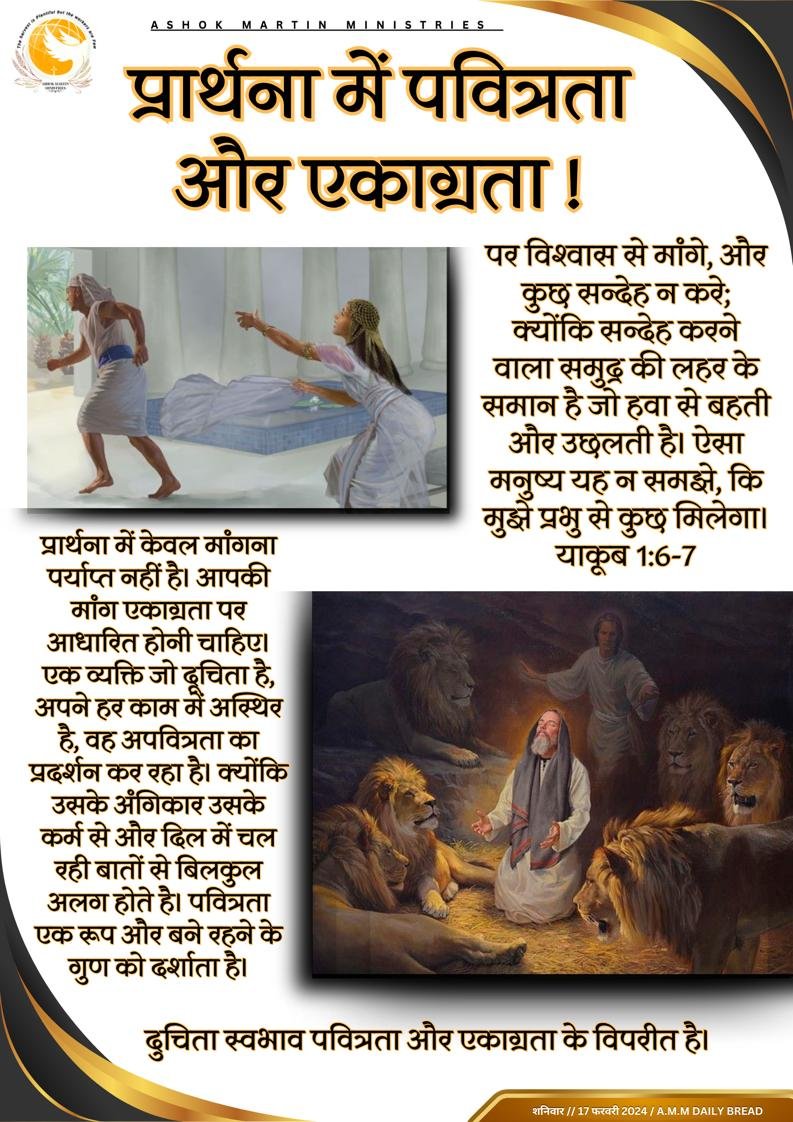 प्रार्थना में केवल मांगना पर्याप्त नहीं है। आपकी मांग एकाग्रता पर आधारित होनी चाहिए। एक व्यक्ति जो दूचिता है, अपने हर काम में अस्थिर है, वह अपवित्रता का प्रदर्शन कर रहा है। क्योंकि उसके अंगिकार उसके कर्म से और दिल में चल रही बातों से बिलकुल अलग होते है। दोनो बातों में कोई एकाग्रता नहीं है। परमेश्वर कहते हैं, “यदि तुम मुझसे कुछ मांगते हो और फिर इस बात पर संदेह भी करते हो कि मैं इसे दूंगा, तो यह भी मत सोचो कि तुम इसे प्राप्त करोगे।” यदि हम संदेह करते हैं तो परमेश्वर प्रार्थना का जवाब नहीं दे सकता क्योंकि परमेश्वर पवित्र है। और पवित्रता की मांग यह है कि जो जो परमेश्वर ने अपने वचन में कहा उसके प्रति वह सच्चा रहे।