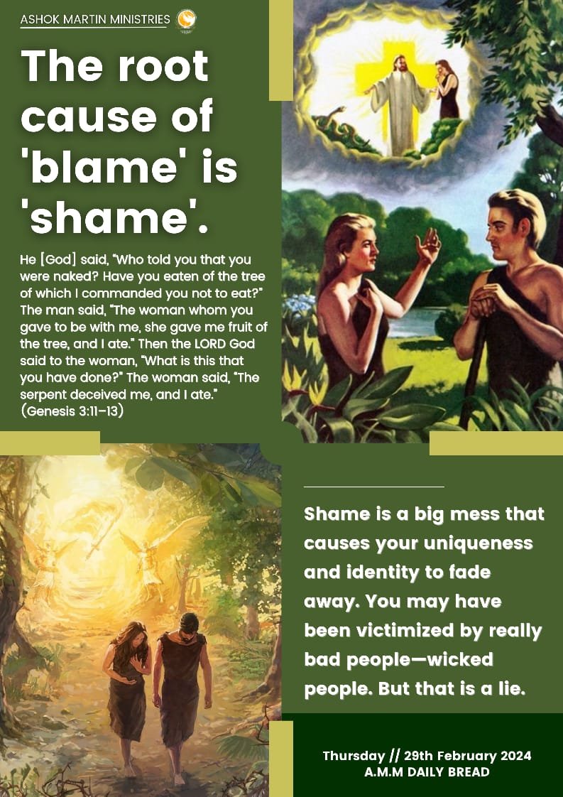 Thursday // 29th February 2024 The root cause of ‘blame’ is ‘shame’. He [God] said, “Who told you that you were naked? Have you eaten of the tree of which I commanded you not to eat?” The man said, “The woman whom you gave to be with me, she gave me fruit of the tree, and I ate.” Then the LORD God said to the woman, “What is this that you have done?” The woman said, “The serpent deceived me, and I ate.” (Genesis 3:11–13) Shame is disorienting. Once we are in it, we are not very good at remembering how we got there. Shame is a big mess that causes your uniqueness and identity to fade away. All we remember is that something really bad happened to us. Then, when in doubt, we rely on the endless explanation that bad things happen to bad people and really bad things happen to really bad people. You may have been victimized by really bad people—wicked people. People are wicked because wickedness is in their hearts. In their wickedness such people might defend themselves by blaming you. You might believe them because their anger is confident, and confident people are hard to disagree with. But that is a lie. Jesus and the early disciples weren’t really bad people, but really bad things happened to them. This alone should persuade you that bad things can happen to very good people. Do not blame yourselves thinking that you will then have more control. If you are responsible for whatever went wrong or whatever hurt you then just strive to figure out how to keep it from happening again. You can do this when your senses are trained to think according to God’s word. Let us receive the grace to get rid of all shame in Jesus’ precious name. Amen ! Your brother in Christ, Apostle Ashok Martin