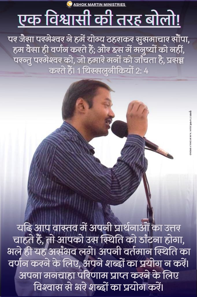 अपनी बीमारी को डांटे, अपने बिगड़े रिश्तों को ठीक होने का आदेश दो। पैसों की कमी जैसी पहाड़ों के बारे में प्रार्थना मत करो, ऐसे पहाड़ों की तो बात भी मत करो, बल्कि इसके बजाय, उन पहाड़ों को हटने की आज्ञा दो। यदि आप वास्तव में अपनी प्रार्थनाओं का उत्तर चाहते हैं, तो आपको उस स्थिति को डांटना होगा, भले ही यह असंभव लगे। अपनी वर्तमान स्थिति का वर्णन करने के लिए, अपने शब्दों का प्रयोग न करें। अपना मनचाहा परिणाम प्राप्त करने के लिए विश्वास से भरे शब्दों का प्रयोग करें।
