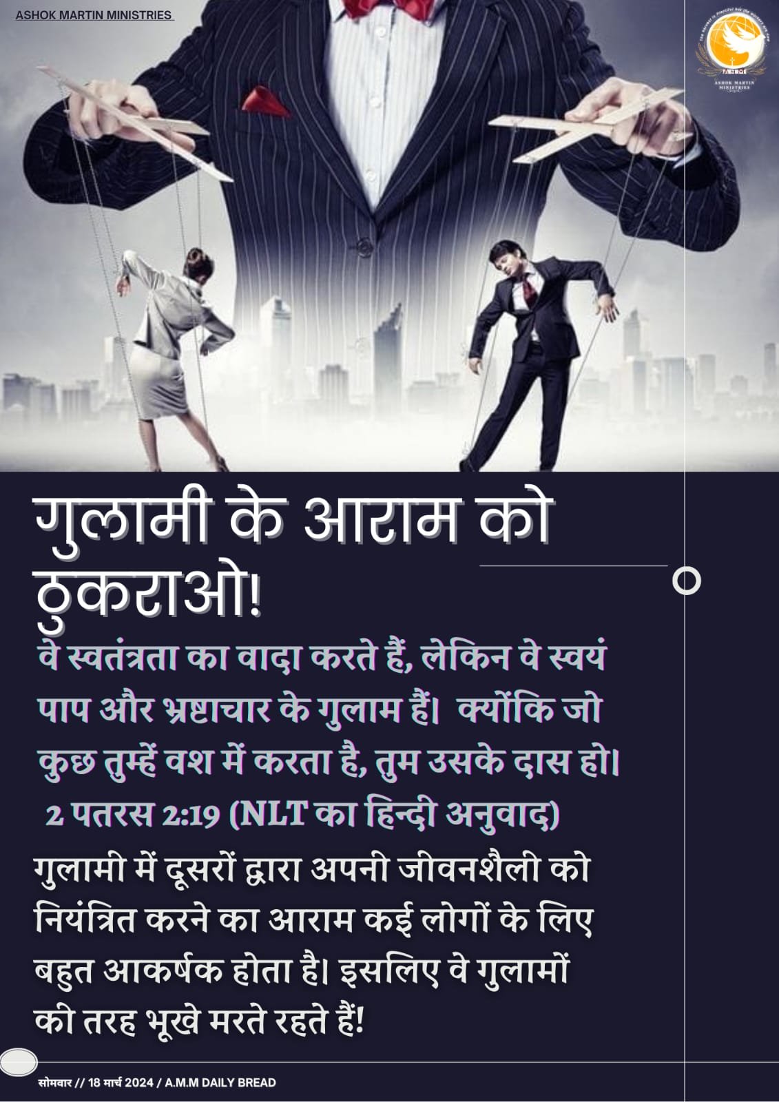 वे स्वतंत्रता का वादा करते हैं, लेकिन वे स्वयं पाप और भ्रष्टाचार के गुलाम हैं। क्योंकि जो कुछ तुम्हें वश में करता है, तुम उसके दास हो।
