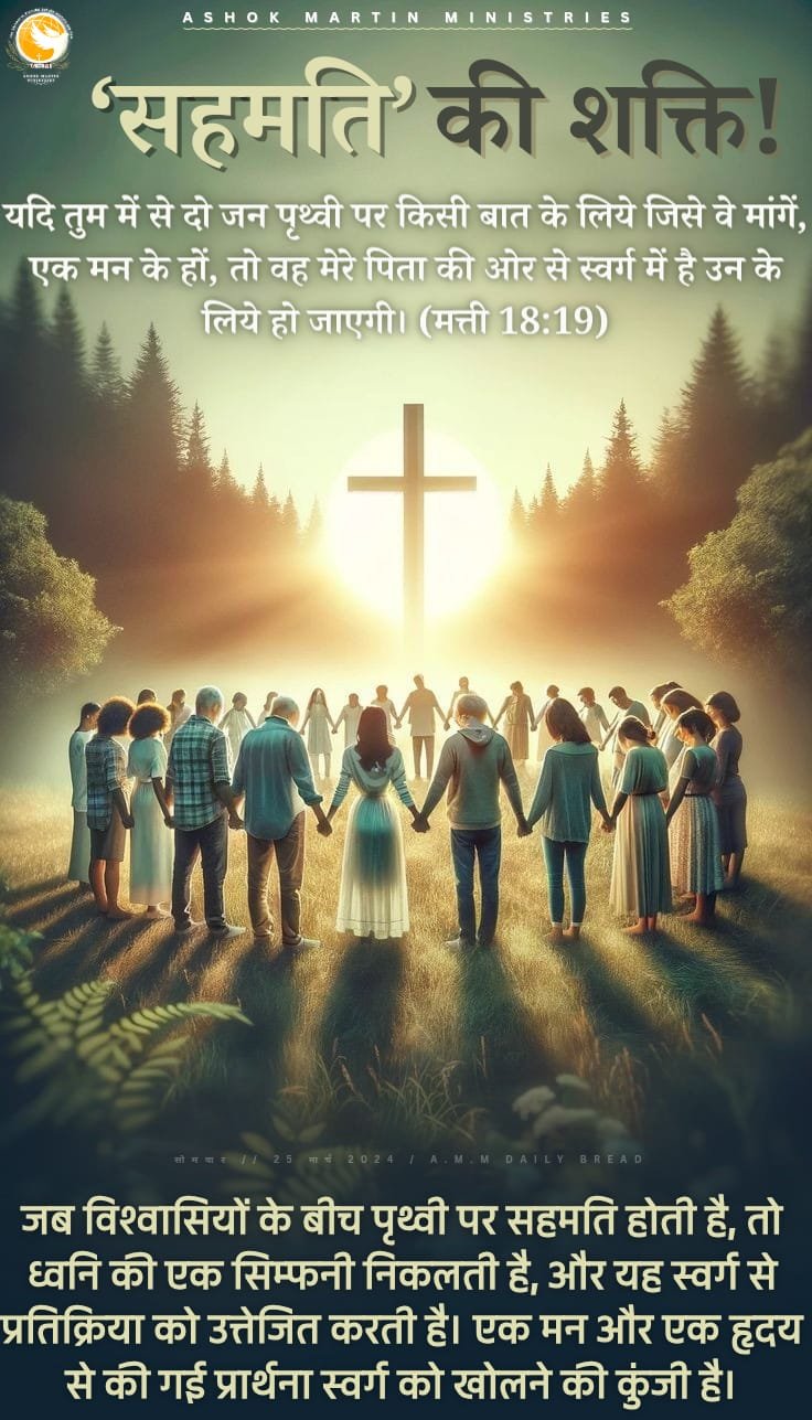 फिर मैं तुम से कहता हूं, यदि तुम में से दो जन पृथ्वी पर किसी बात के लिये जिसे वे मांगें, एक मन के हों, तो वह मेरे पिता की ओर से स्वर्ग में है उन के लिये हो जाएगी।