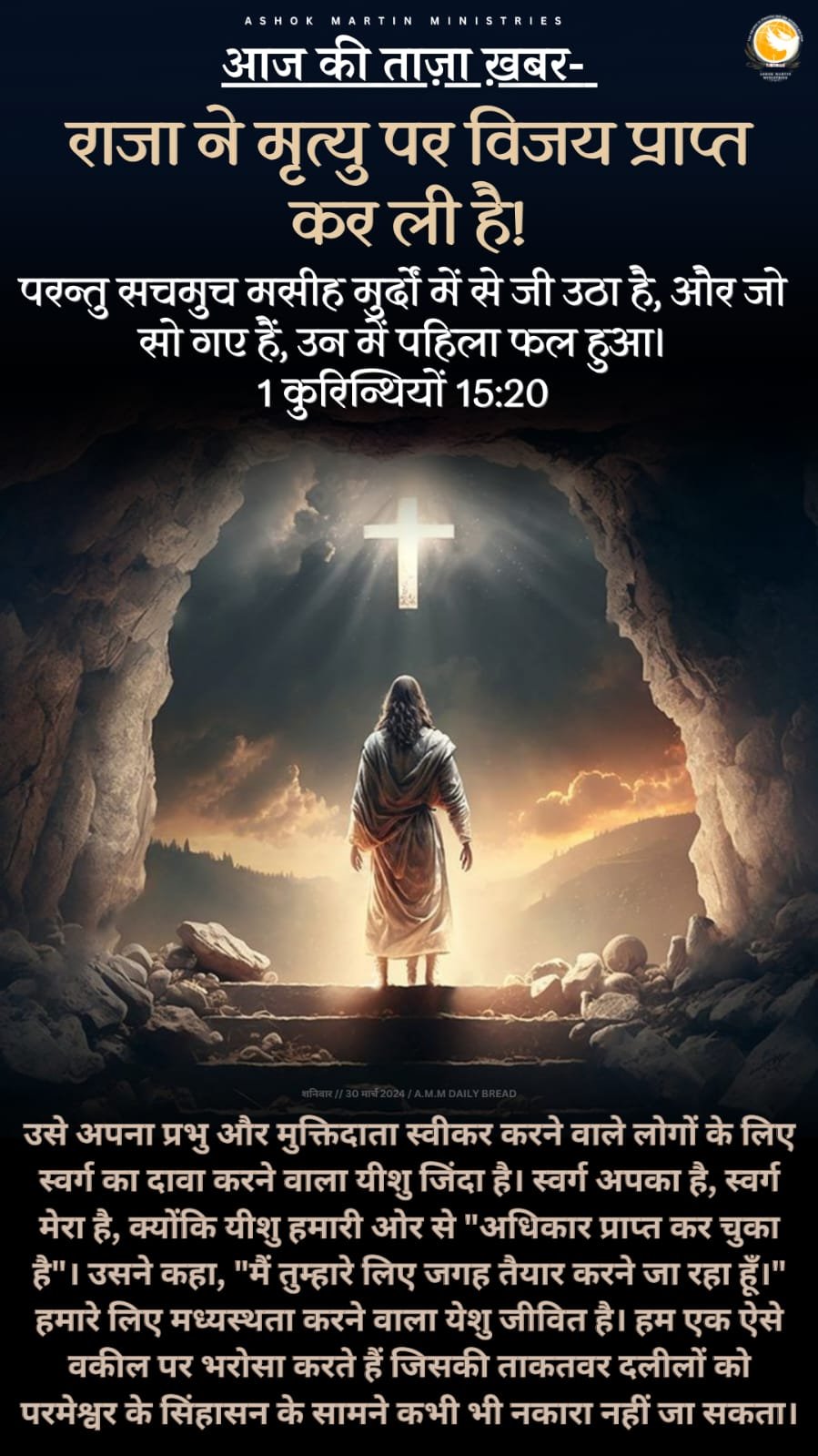 यीशु मरे, और यीशु फिर से जी उठे, यीशु आज भी जीवित है….. इस बात को कभी न भूलें। उसे अपना प्रभु और मुक्तिदाता स्वीकर करने वाले लोगों के लिए स्वर्ग का दावा करने वाला यीशु जिंदा है। पिता के सामने वो हमारा प्रतिनिधि है। प्रियों, स्वर्ग आपका है, स्वर्ग मेरा है, क्योंकि यीशु हमारी ओर से “अधिकार प्राप्त कर चुका है”। उसके छिदे हुए हाथ ने हम लोगों के लिए, जिनके लिए उसने अपना खून बहाया था, अनंत आनंद को थाम लिया है ।