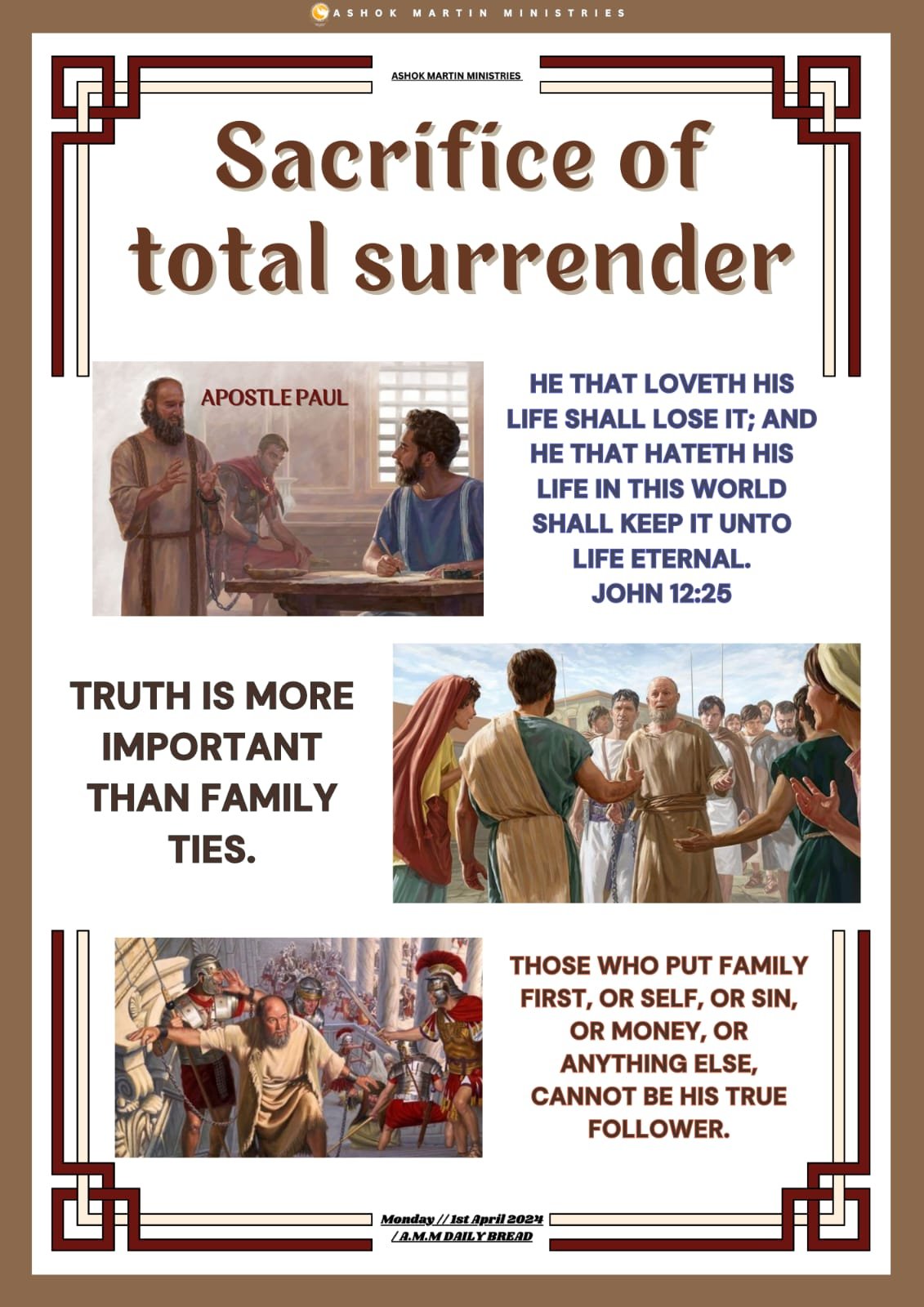 But Christ demands first place in our hearts, and we must be willing to choose Him instead of relatives. Truth is more important than family ties. Those who put family first, or self, or sin, or money, or anything else, cannot be His true follower.