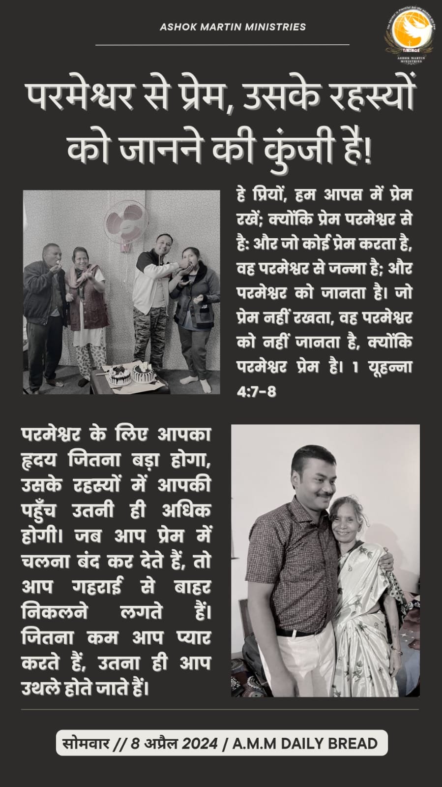 हे प्रियों, हम आपस में प्रेम रखें; क्योंकि प्रेम परमेश्वर से है: और जो कोई प्रेम करता है, वह परमेश्वर से जन्मा है; और परमेश्वर को जानता है। जो प्रेम नहीं रखता, वह परमेश्वर को नहीं जानता है, क्योंकि परमेश्वर प्रेम है।