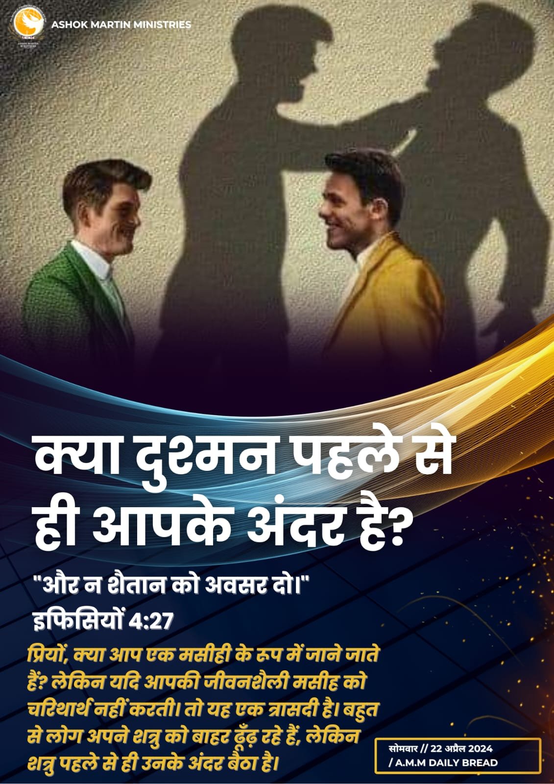 प्रियों, क्या आप एक मसीही के रूप में जाने जाते हैं? शायद आप स्तुति और आराधना के गीत गाना जानते होगें, लेकिन यदि आपकी जीवनशैली मसीह को चरिथार्थ नहीं करती। तो यह एक त्रासदी है। हमें कड़ी प्रार्थना करने की ज़रूरत है क्योंकि बहुत से लोग अपने शत्रु को बाहर ढूँढ़ रहे हैं, लेकिन शत्रु पहले से ही उनके अंदर बैठा है।