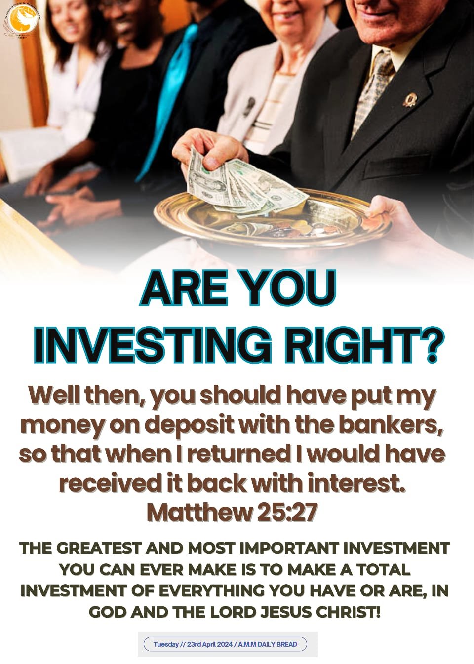 Everything you have or own is invested in something. Your life, your mind, your time, your ability, your money – every single solitary thing that you possess is invested in one way or another in something or someone. The greatest and most important investment you can ever make is to make a total investment of everything you have or are, in God and the Lord Jesus Christ!