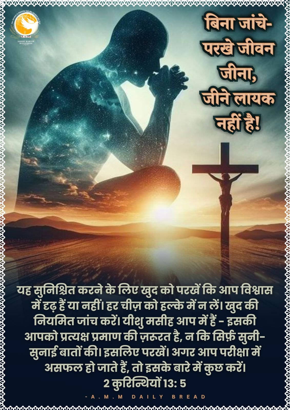 यह सुनिश्चित करने के लिए खुद को परखें कि आप विश्वास में दृढ़ हैं या नहीं। हर चीज़ को हल्के में न लें। खुद की नियमित जांच करें। यीशु मसीह आप में हैं – इसकी आपको प्रत्यक्ष प्रमाण की ज़रूरत है, न कि सिर्फ़ सुनी-सुनाई बातों की। इसलिए परखें। अगर आप परीक्षा में असफल हो जाते हैं, तो इसके बारे में कुछ करें।