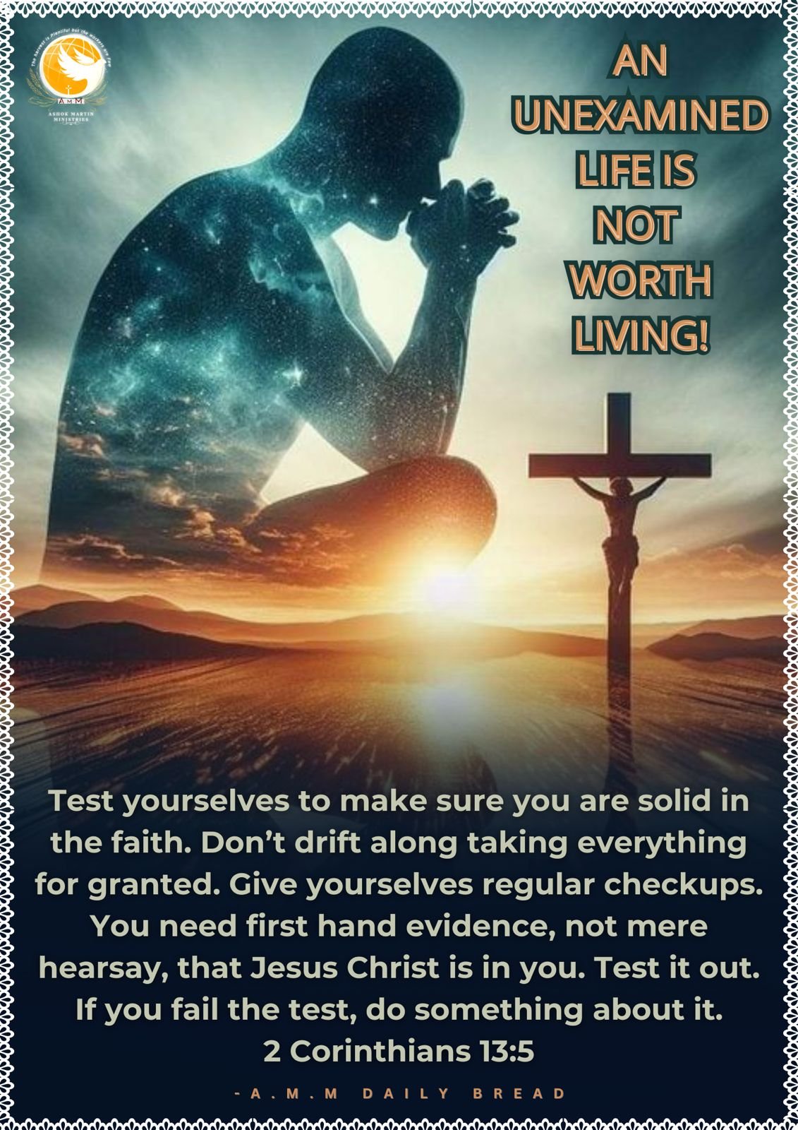 Test yourselves to make sure you are solid in the faith. Don’t drift along taking everything for granted. Give yourselves regular checkups. You need first hand evidence, not mere hearsay, that Jesus Christ is in you. Test it out. If you fail the test, do something about it.