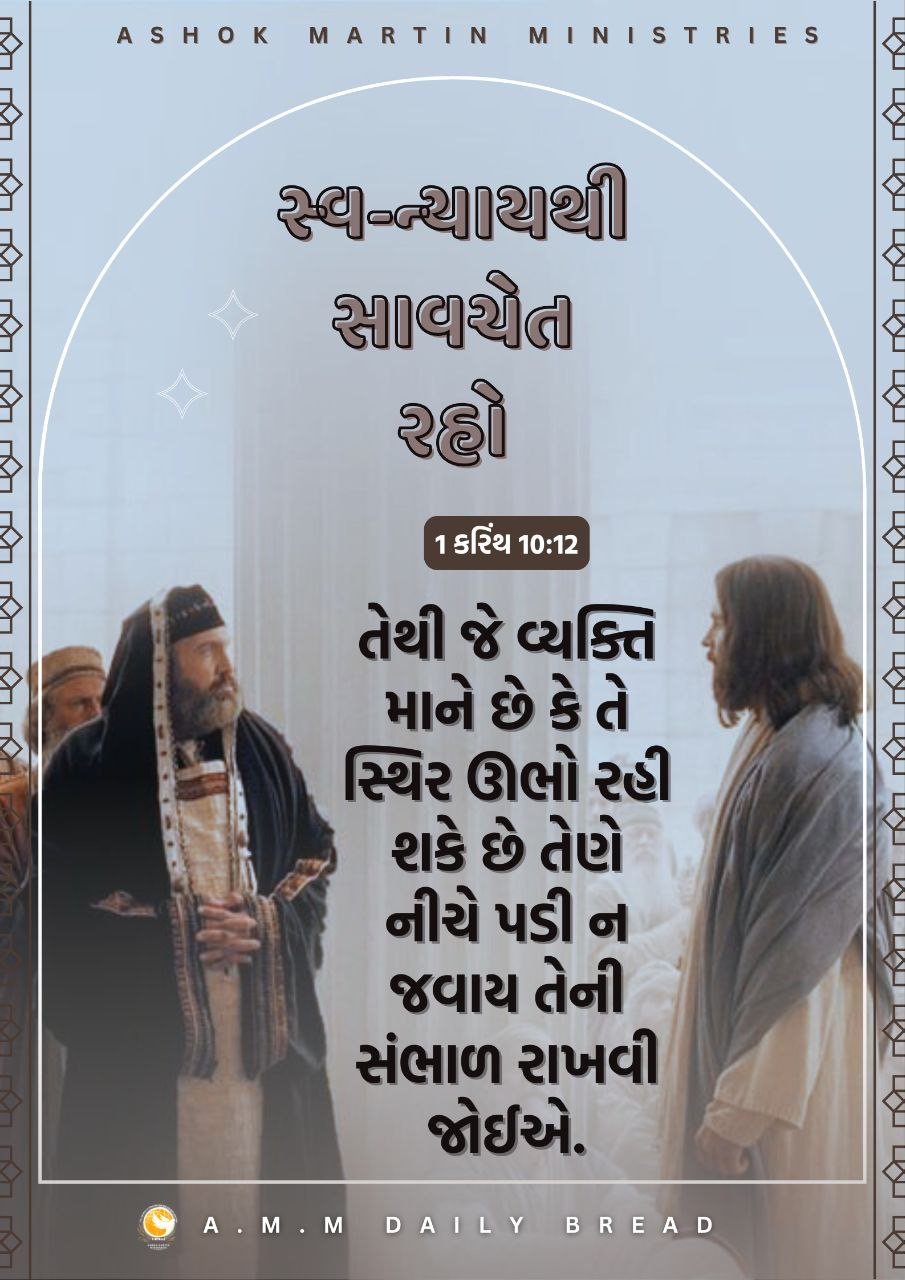 ઈસુ ખ્રિસ્ત ગઈકાલે, આજે અને હંમેશ માટે સમાન છે. તેથી છેતરશો નહીં: કરેલા સારા કાર્યોનો અપ્રિય આત્મસંતોષ એ આપણા પરમેશ્વરને સૌથી વધુ ગુસ્સે કરે છે. પરમેશ્વરના શબ્દના પ્રધાન તરીકે, તમારા હૃદયની રક્ષા કરવા માટેના સૌથી ડરામણા શત્રુઓમાંનું એક સ્વ-ન્યાય છે. બ્રહ્માંડમાં માત્ર એક જ વ્યક્તિ છે જેને સ્વ-ન્યાયી બનવાનો અધિકાર છે, અને તે પોતે એવું કરતાં નથી. તેથી ઈસુ પાસેથી તમે શીખ લો. અભિમાનનું પરિણામ નાશ છે, અને પતનની પહેલાં ગવિર્ષ્ઠ સ્વભાવ આવે છે.. (સુભાષિતો 16:18)