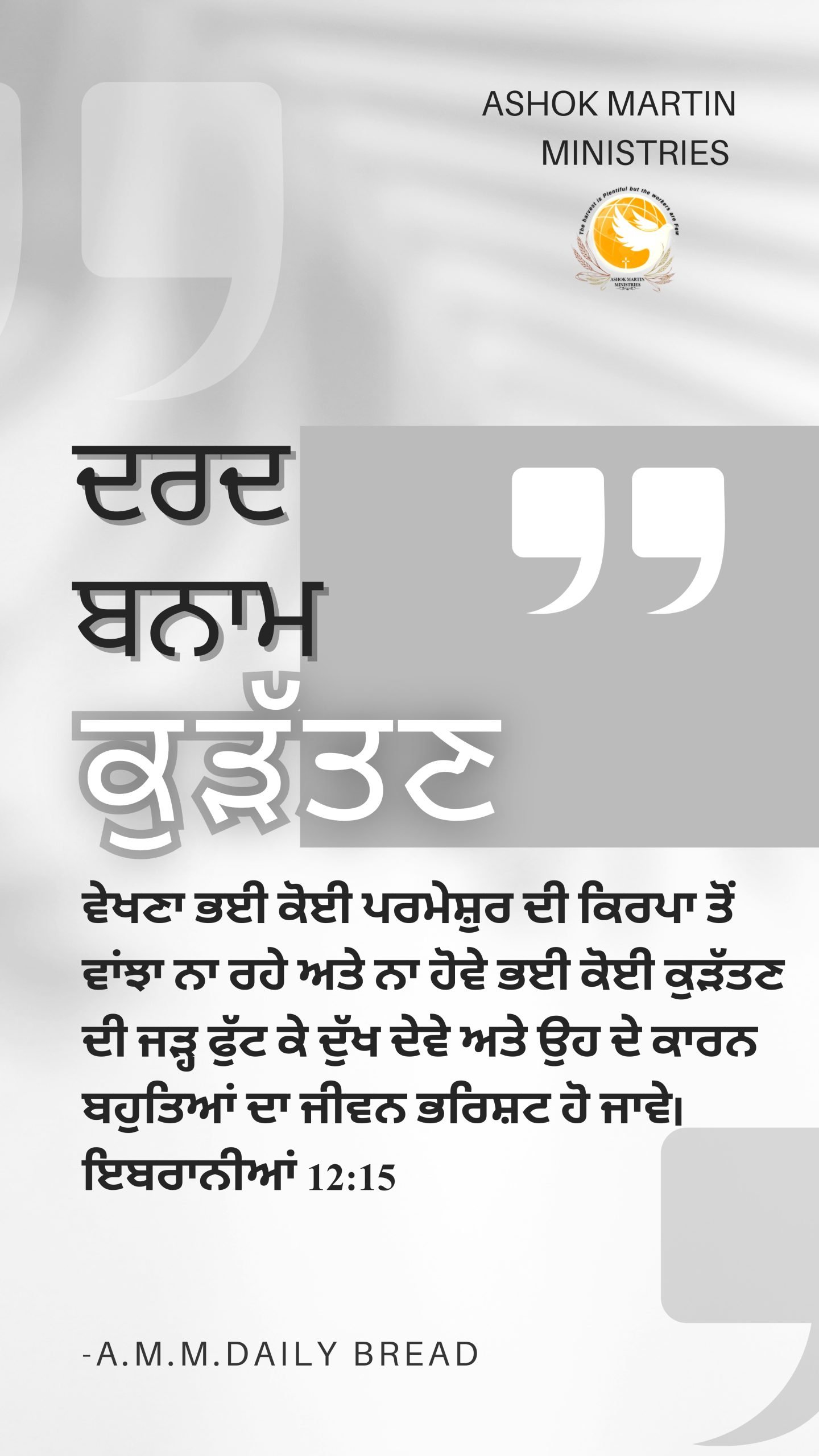 ਵੇਖਣਾ ਭਈ ਕੋਈ ਪਰਮੇਸ਼ੁਰ ਦੀ ਕਿਰਪਾ ਤੋਂ ਵਾਂਝਾ ਨਾ ਰਹੇ ਅਤੇ ਨਾ ਹੋਵੇ ਭਈ ਕੋਈ ਕੁੜੱਤਣ ਦੀ ਜੜ੍ਹ ਫੁੱਟ ਕੇ ਦੁੱਖ ਦੇਵੇ ਅਤੇ ਉਹ ਦੇ ਕਾਰਨ ਬਹੁਤਿਆਂ ਦਾ ਜੀਵਨ ਭਰਿਸ਼ਟ ਹੋ ਜਾਵੇ।