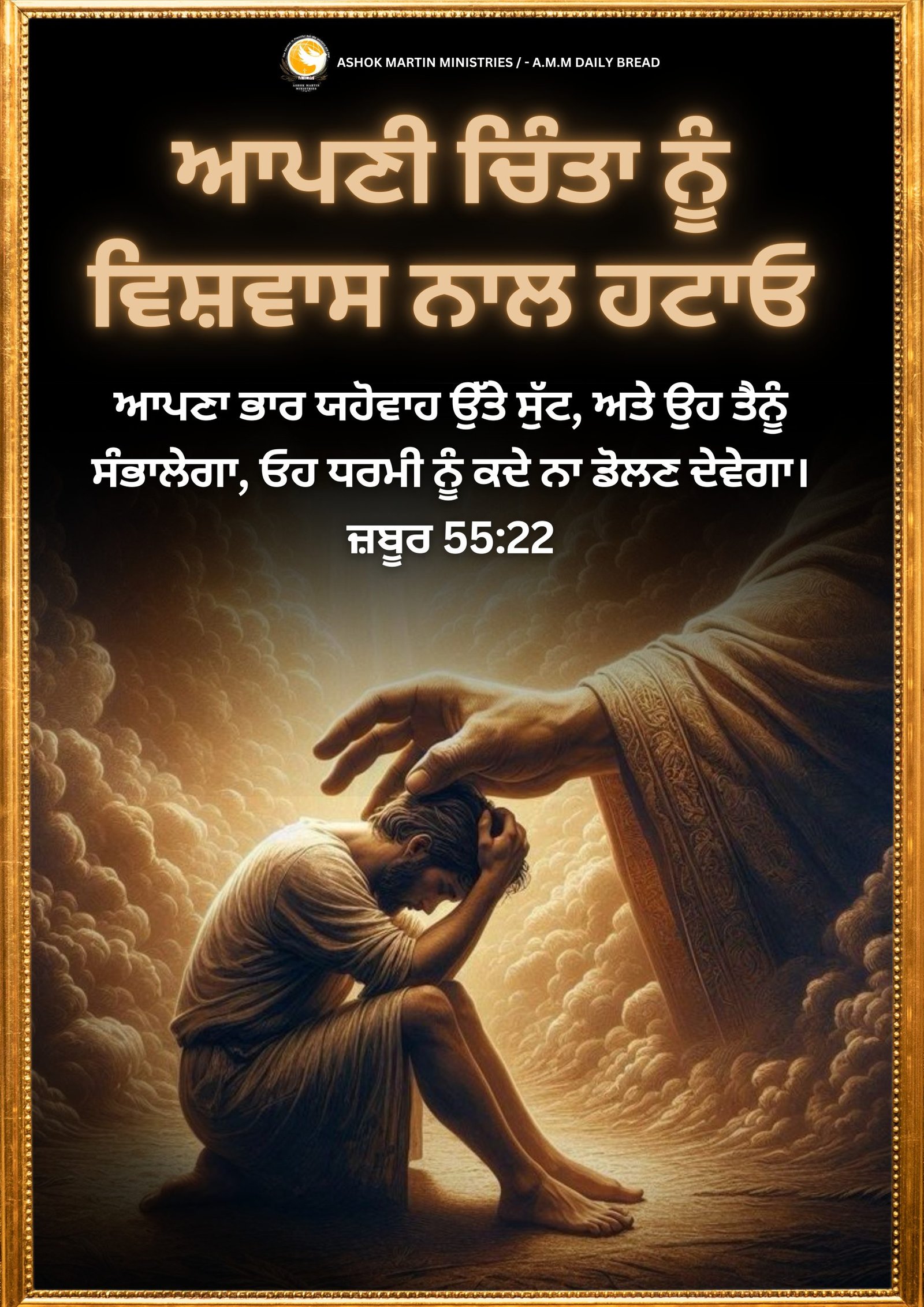 ਚਿੰਤਾ ਨੂੰ ਸੰਭਾਲਿਆ ਜਾ ਸਕਦਾ ਹੈ. ਗਾਲਾਂ ਕੱਢਣ ਨਾਲ, ਰੋਣ ਨਾਲ, ਨਸ਼ੇ ਕਰਨ ਨਾਲ, ਸ਼ਰਾਬ ਪੀ ਕੇ, ਕਿਸੇ ‘ਤੇ ਵਾਰ ਕਰਕੇ, ਆਪਣੇ ਆਪ ਨੂੰ ਤਰਸ ਦੇ ਕੇ ਜਾਂ ਰੱਬ ਨੂੰ ਦੋਸ਼ੀ ਠਹਿਰਾ ਕੇ ਨਹੀਂ। ਚਿੰਤਾ ਨੂੰ ਸੰਭਾਲਿਆ ਜਾ ਸਕਦਾ ਹੈ ਕਿਉਂਕਿ ਤੁਹਾਡੇ ਕੋਲ ਵਿਸ਼ਵਾਸ ਹੈ। ਇਹ ਤੁਹਾਨੂੰ ਪ੍ਰਮੇਸ਼ਰ ਤੱਕ ਸਿੱਧੀ ਪਹੁੰਚ ਦਿੰਦਾ ਹੈ ਜਿਵੇਂ ਤੁਸੀਂ ਇਸਨੂੰ ਜਾਰੀ ਕਰਦੇ ਹੋ। ਇਹ ਤੁਹਾਨੂੰ ਸਿੱਧਾ ਉਸ ਕੋਲ ਲੈ ਜਾਂਦਾ ਹੈ ਜੋ ਤੁਹਾਨੂੰ ਚਿੰਤਾ ਤੋਂ ਮੁਕਤ ਕਰਨ ਦਾ ਪੂਰਨ ਸਰੋਤ ਹੈ।