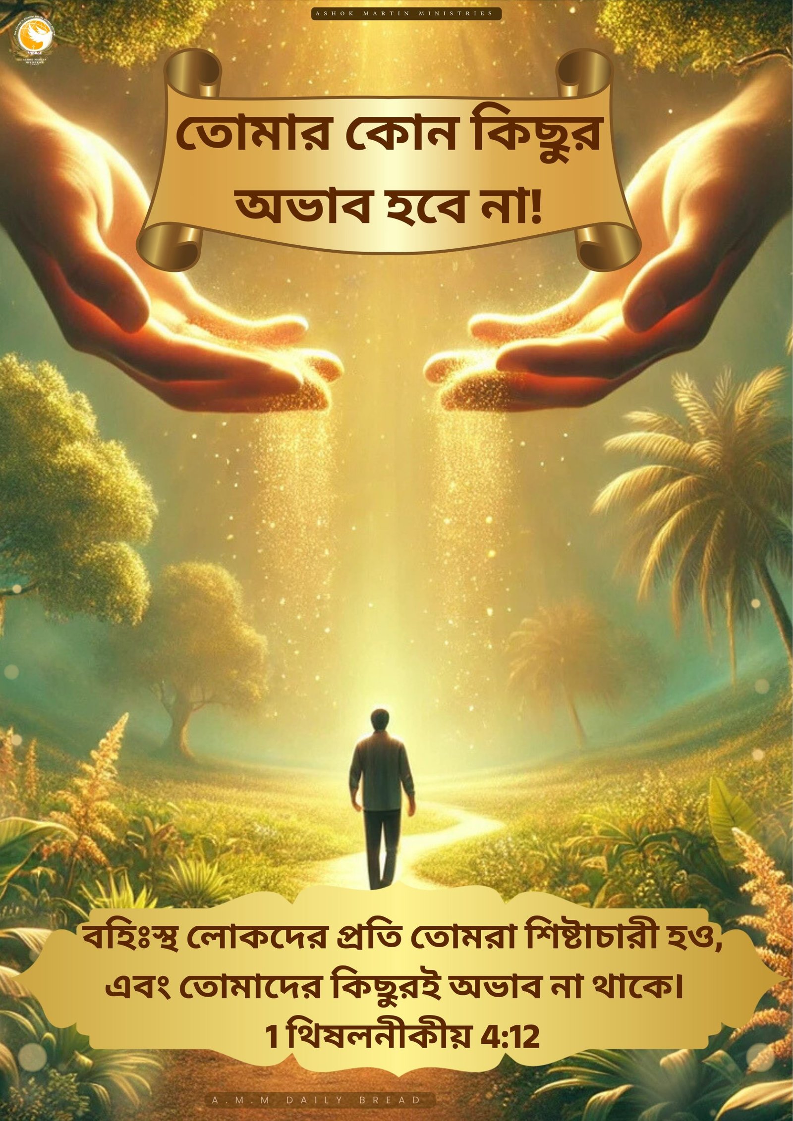 ঈশ্বর আদেশ দিয়েছেন যে আপনি “কোন কিছুর অভাব করবেন না” (1 থিসলনীকীয় 4:12) যার অর্থ হল ঈশ্বর আপনার পাশে আছেন। তিনি চান না আপনার কোন কিছুর অভাব হোক। ঈশ্বর তাঁর শক্তি সক্রিয় করেছেন “আপনার যা অভাব তা পূরণ করতে” (ফিলিপীয় 2:30)। তিনি আমাদের এখানে দেখান যে তিনি ঈশ্বরের পুরুষ ও মহিলাদেরকে আপনার পথ পাঠান যাতে আপনার অভাবের জন্য তাঁর বিধান দেখানোর জন্য এবং কীভাবে তা গ্রহণ করা যায় তা দেখানোর জন্য।