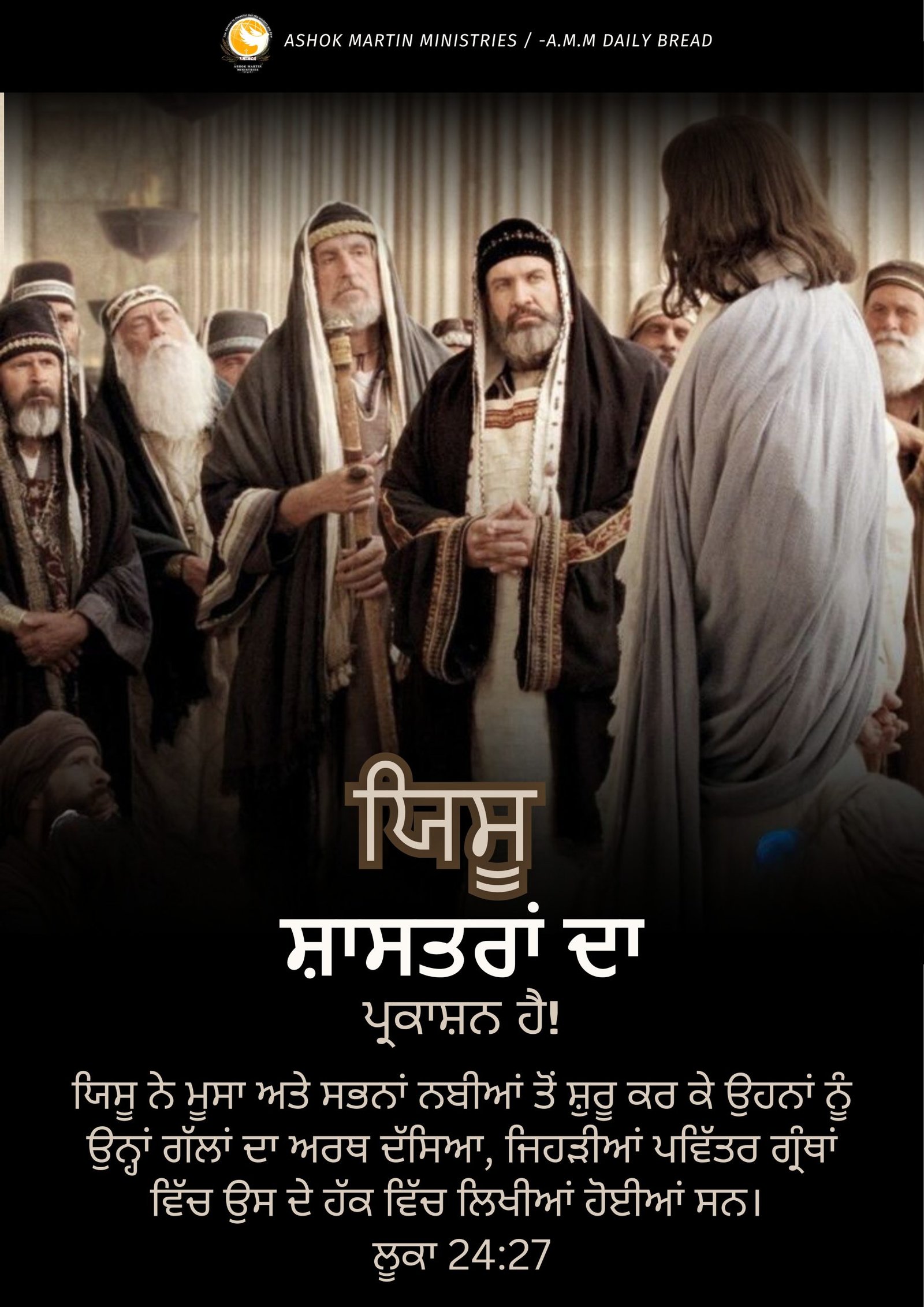 ਯਿਸੂ ਨੇ ਮੂਸਾ ਅਤੇ ਸਭਨਾਂ ਨਬੀਆਂ ਤੋਂ ਸ਼ੁਰੂ ਕਰ ਕੇ ਉਹਨਾਂ ਨੂੰ ਉਨ੍ਹਾਂ ਗੱਲਾਂ ਦਾ ਅਰਥ ਦੱਸਿਆ, ਜਿਹੜੀਆਂ ਪਵਿੱਤਰ ਗ੍ਰੰਥਾਂ ਵਿੱਚ ਉਸ ਦੇ ਹੱਕ ਵਿੱਚ ਲਿਖੀਆਂ ਹੋਈਆਂ ਸਨ।