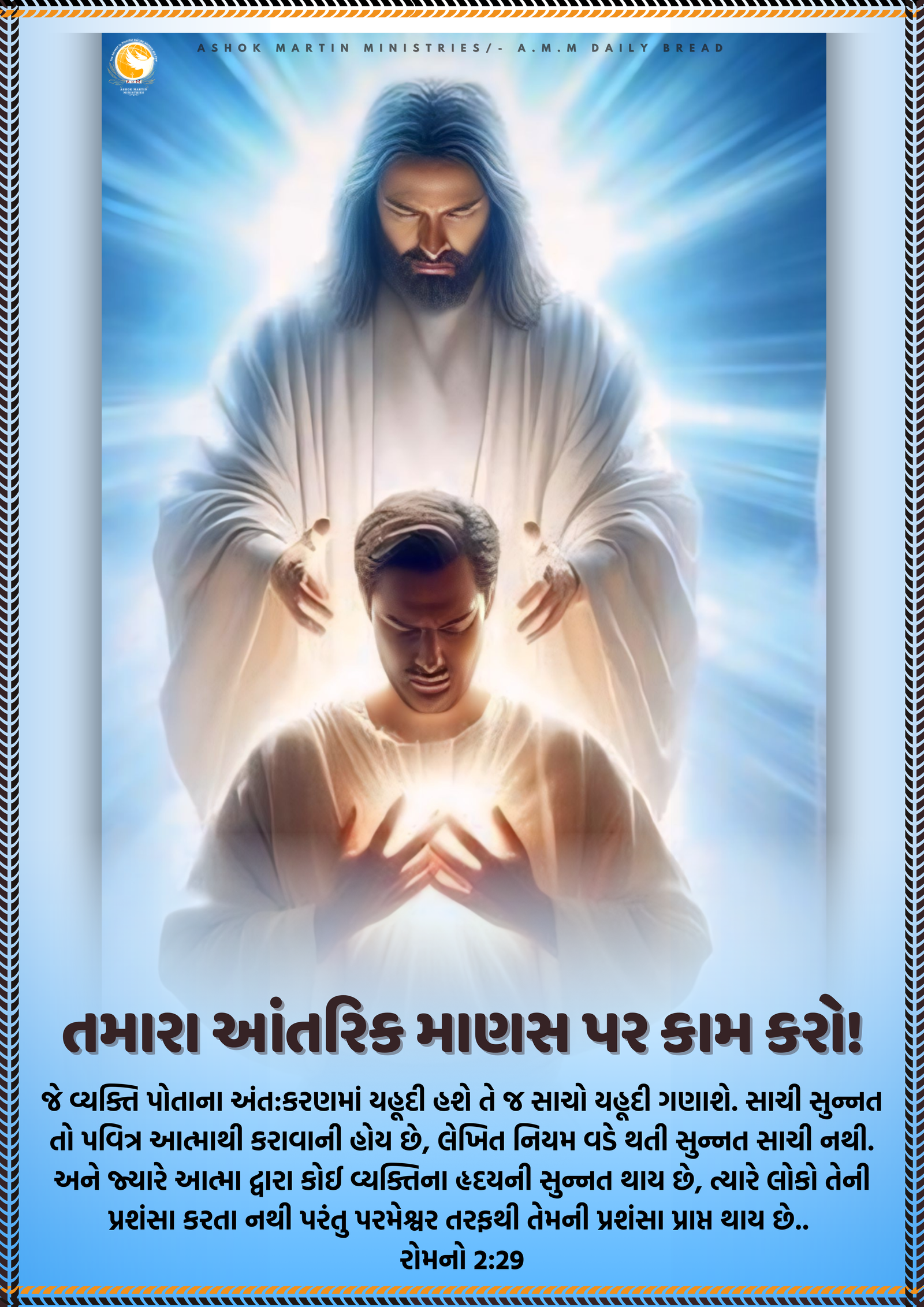 જે વ્યક્તિ પોતાના અંત:કરણમાં યહૂદી હશે તે જ સાચો યહૂદી ગણાશે. સાચી સુન્નત તો પવિત્ર આત્માથી કરાવાની હોય છે, લેખિત નિયમ વડે થતી સુન્નત સાચી નથી. અને જ્યારે આત્મા દ્વારા કોઈ વ્યક્તિના હૃદયની સુન્નત થાય છે, ત્યારે લોકો તેની પ્રશંસા કરતા નથી પરંતુ પરમેશ્વર તરફથી તેમની પ્રશંસા પ્રાપ્ત થાય છે.. રોમનો 2:29 AMP અનુસાર