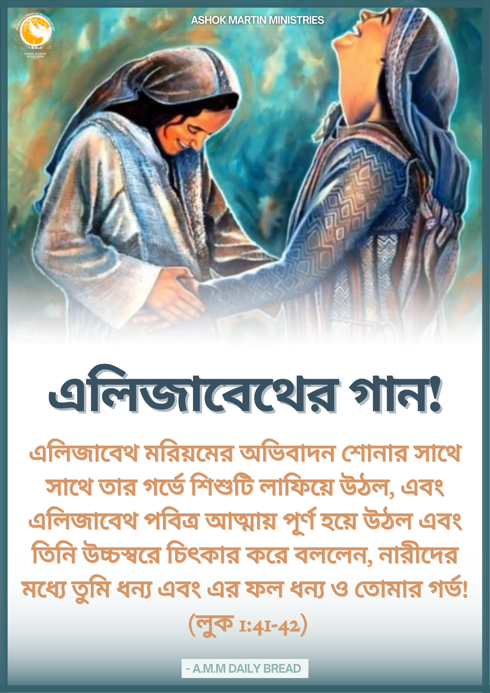 এলিজাবেথ মরিয়মের অভিবাদন শোনার সাথে সাথে তার গর্ভে শিশুটি লাফিয়ে উঠল, এবং এলিজাবেথ পবিত্র আত্মায় পূর্ণ হয়ে উঠল এবং তিনি উচ্চস্বরে চিৎকার করে বললেন, নারীদের মধ্যে তুমি ধন্য এবং এর ফল ধন্য ও তোমার গর্ভ! (লুক 1:41-42)