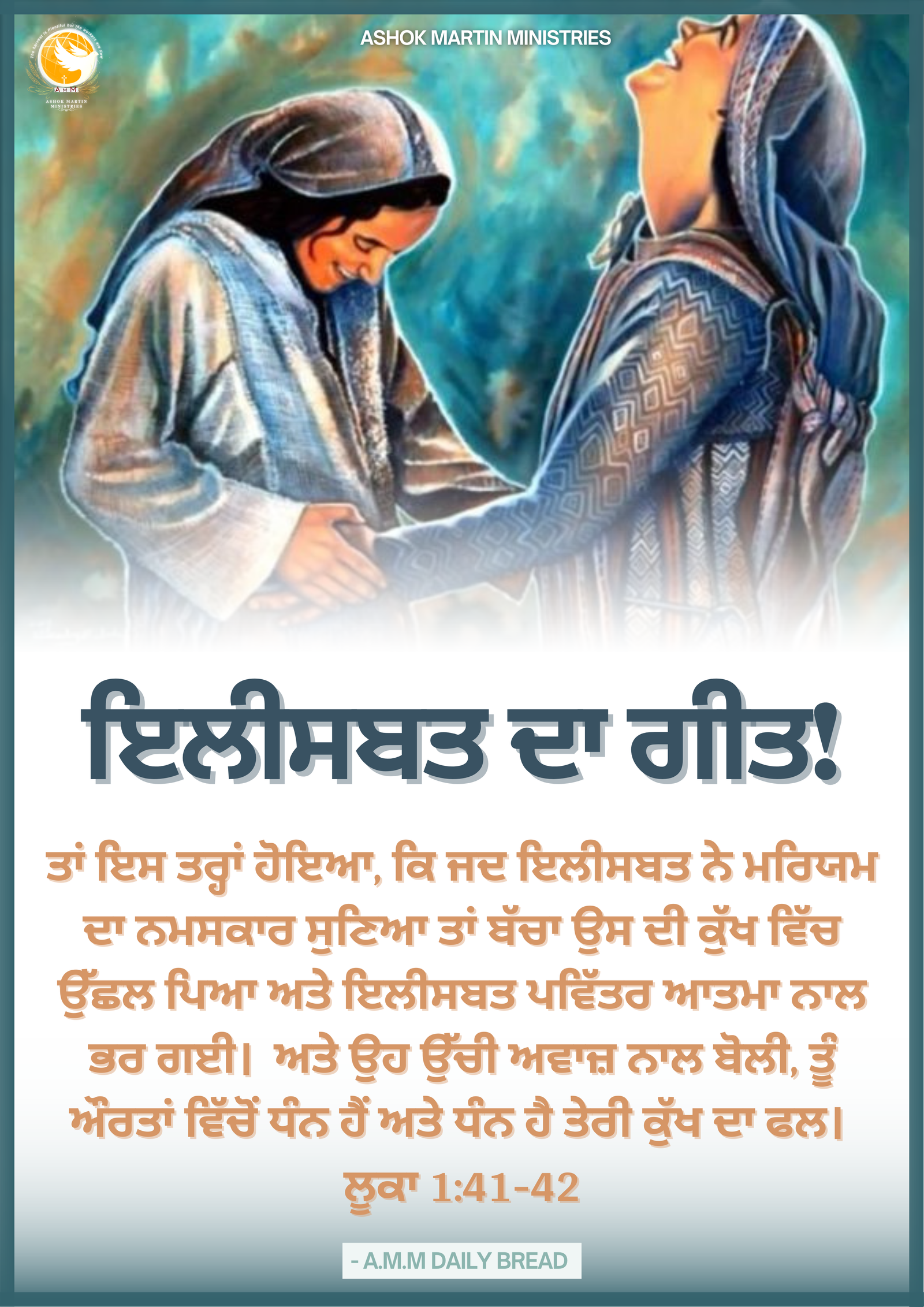 ਤਾਂ ਇਸ ਤਰ੍ਹਾਂ ਹੋਇਆ, ਕਿ ਜਦ ਇਲੀਸਬਤ ਨੇ ਮਰਿਯਮ ਦਾ ਨਮਸਕਾਰ ਸੁਣਿਆ ਤਾਂ ਬੱਚਾ ਉਸ ਦੀ ਕੁੱਖ ਵਿੱਚ ਉੱਛਲ ਪਿਆ ਅਤੇ ਇਲੀਸਬਤ ਪਵਿੱਤਰ ਆਤਮਾ ਨਾਲ ਭਰ ਗਈ। ਅਤੇ ਉਹ ਉੱਚੀ ਅਵਾਜ਼ ਨਾਲ ਬੋਲੀ, ਤੂੰ ਔਰਤਾਂ ਵਿੱਚੋਂ ਧੰਨ ਹੈਂ ਅਤੇ ਧੰਨ ਹੈ ਤੇਰੀ ਕੁੱਖ ਦਾ ਫਲ।