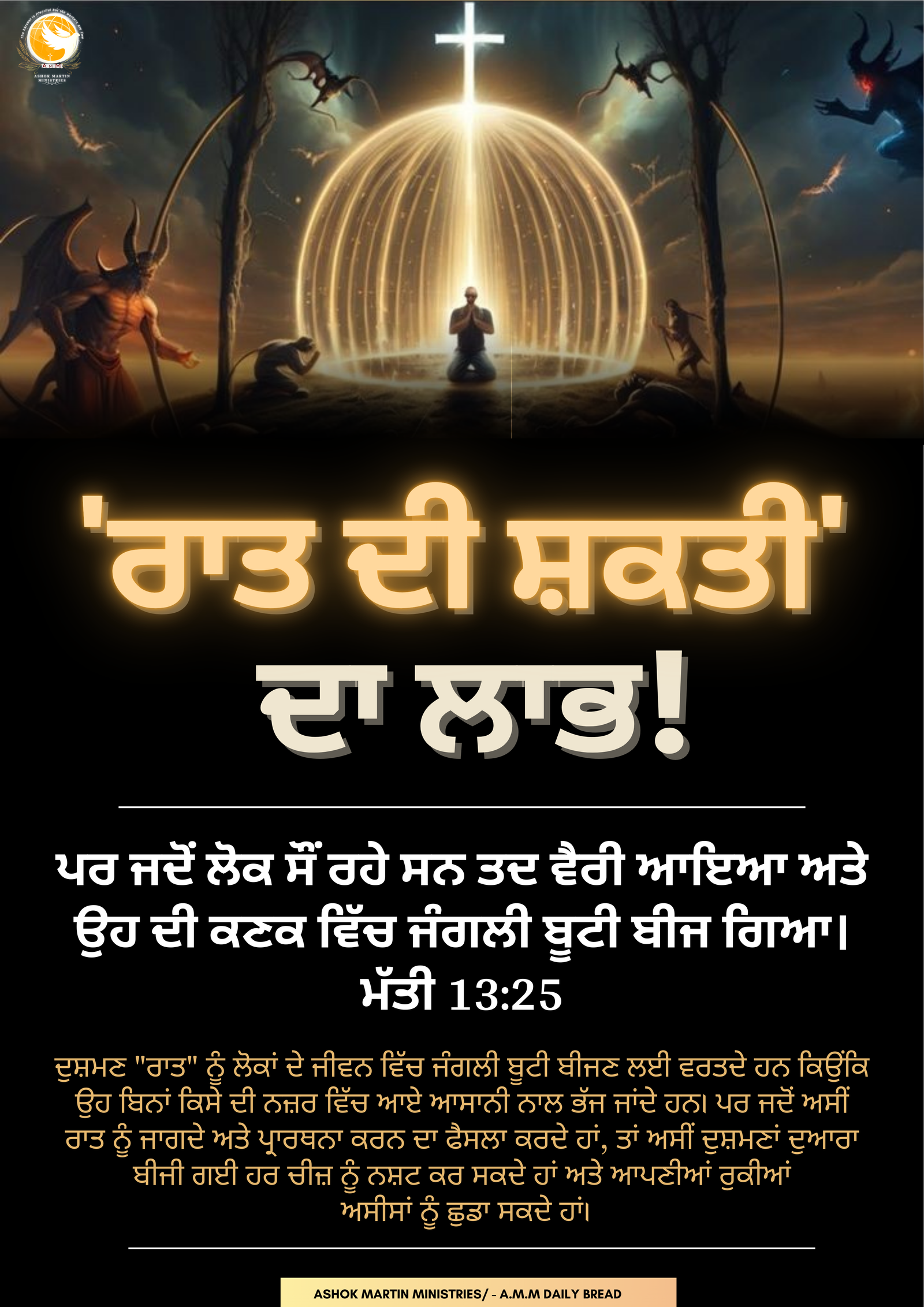 ਦੁਸ਼ਮਣ “ਰਾਤ” ਨੂੰ ਲੋਕਾਂ ਦੇ ਜੀਵਨ ਵਿੱਚ ਜੰਗਲੀ ਬੂਟੀ ਬੀਜਣ ਲਈ ਵਰਤਦੇ ਹਨ ਕਿਉਂਕਿ ਉਹ ਬਿਨਾਂ ਕਿਸੇ ਦੀ ਨਜ਼ਰ ਵਿੱਚ ਆਏ ਆਸਾਨੀ ਨਾਲ ਭੱਜ ਜਾਂਦੇ ਹਨ। ਪਰ ਜਦੋਂ ਅਸੀਂ ਰਾਤ ਨੂੰ ਜਾਗਦੇ ਅਤੇ ਪ੍ਰਾਰਥਨਾ ਕਰਨ ਦਾ ਫੈਸਲਾ ਕਰਦੇ ਹਾਂ, ਤਾਂ ਅਸੀਂ ਦੁਸ਼ਮਣਾਂ ਦੁਆਰਾ ਬੀਜੀ ਗਈ ਹਰ ਚੀਜ਼ ਨੂੰ ਨਸ਼ਟ ਕਰ ਸਕਦੇ ਹਾਂ ਅਤੇ ਆਪਣੀਆਂ ਰੁਕੀਆਂ ਅਸੀਸਾਂ ਨੂੰ ਛੁਡਾ ਸਕਦੇ ਹਾਂ।