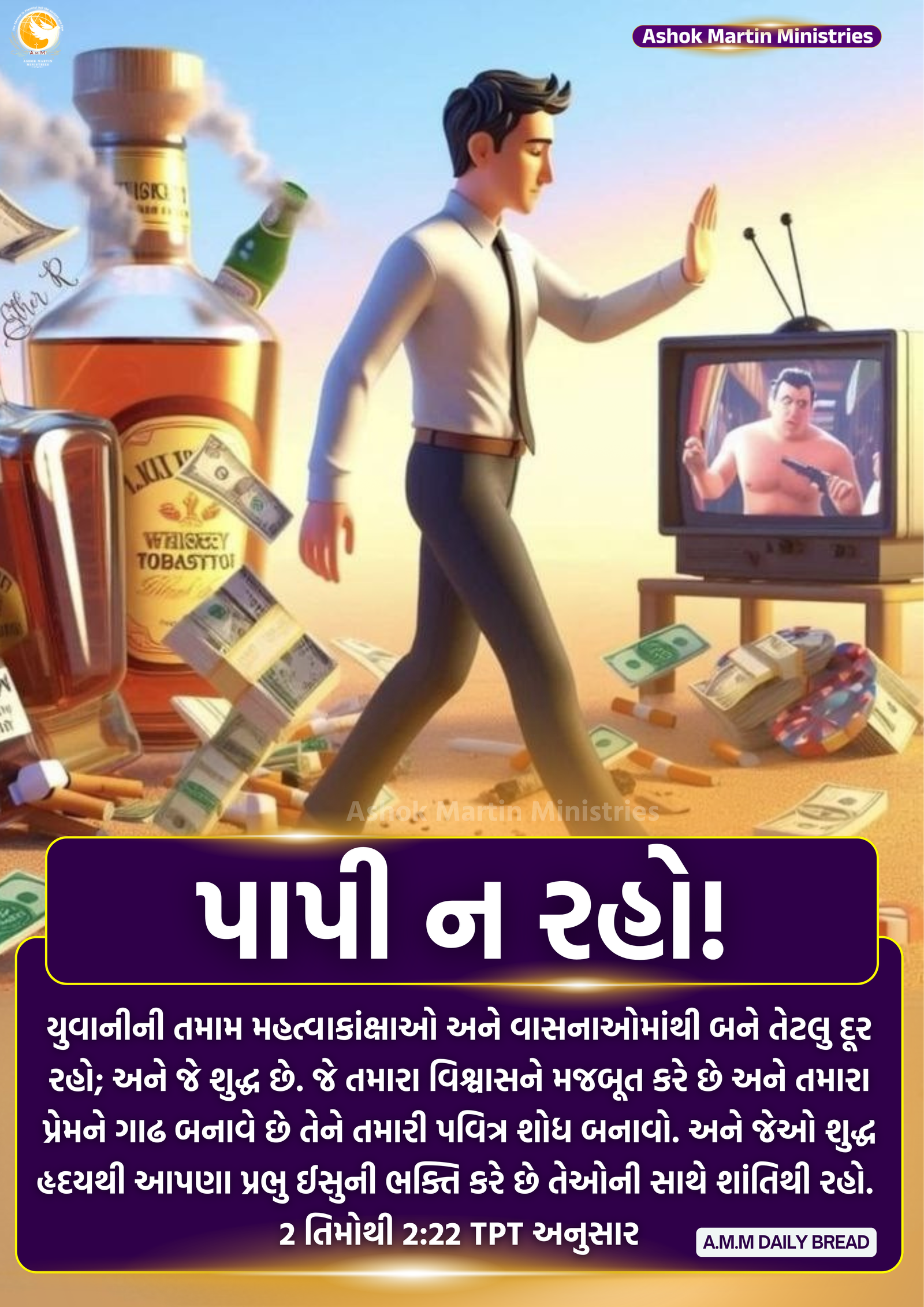 યુવાનીની તમામ મહત્વાકાંક્ષાઓ અને વાસનાઓમાંથી બને તેટલુ દૂર રહો; અને જે શુદ્ધ છે. જે તમારા વિશ્વાસને મજબૂત કરે છે અને તમારા પ્રેમને ગાઢ બનાવે છે તેને તમારી પવિત્ર શોધ બનાવો. અને જેઓ શુદ્ધ હૃદયથી આપણા પ્રભુ ઈસુની ભક્તિ કરે છે તેઓની સાથે શાંતિથી રહો. 2 તિમોથી 2:22 TPT અનુસાર