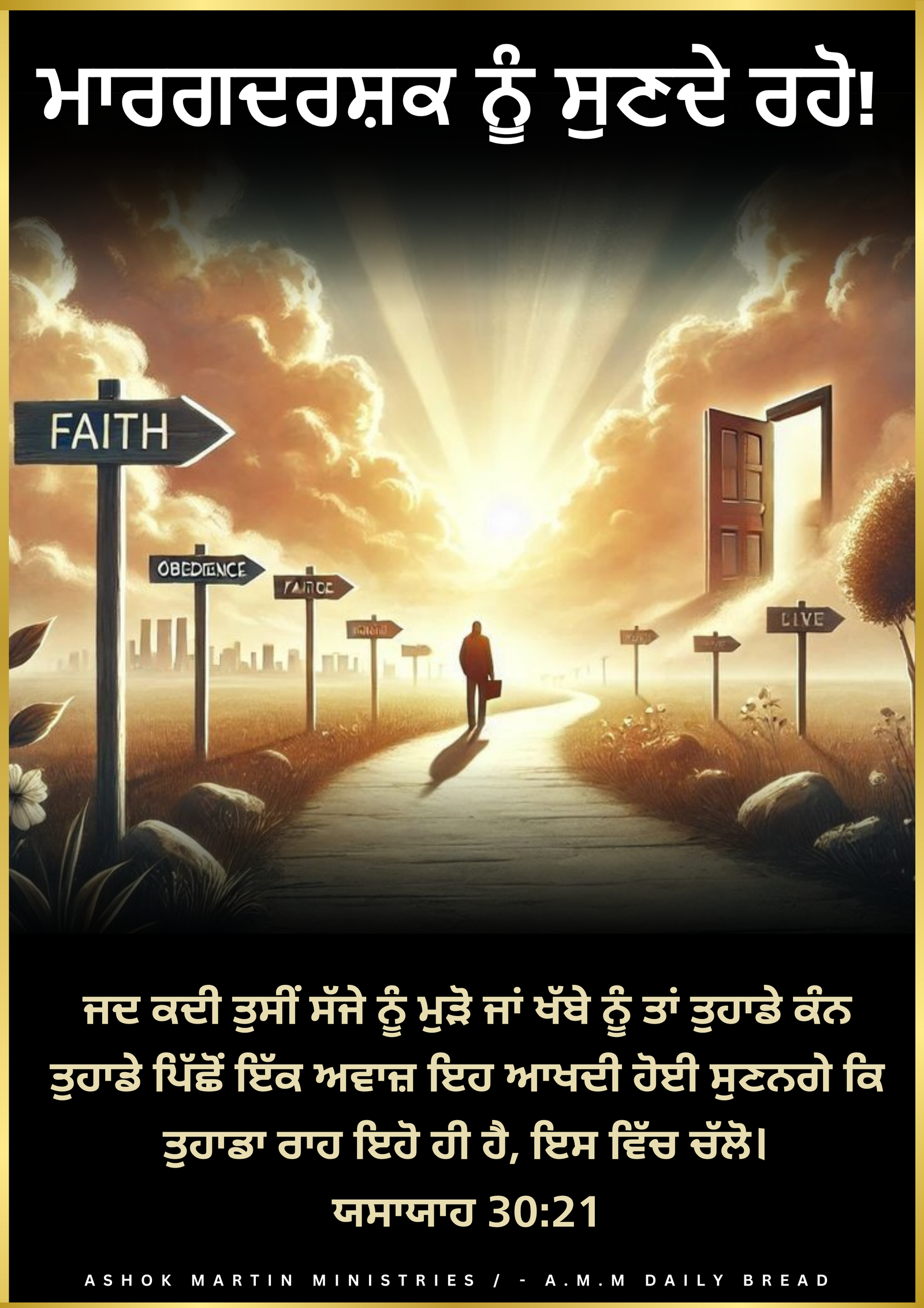 ਜਦ ਕਦੀ ਤੁਸੀਂ ਸੱਜੇ ਨੂੰ ਮੁੜੋ ਜਾਂ ਖੱਬੇ ਨੂੰ ਤਾਂ ਤੁਹਾਡੇ ਕੰਨ ਤੁਹਾਡੇ ਪਿੱਛੋਂ ਇੱਕ ਅਵਾਜ਼ ਇਹ ਆਖਦੀ ਹੋਈ ਸੁਣਨਗੇ ਕਿ ਤੁਹਾਡਾ ਰਾਹ ਇਹੋ ਹੀ ਹੈ, ਇਸ ਵਿੱਚ ਚੱਲੋ।
