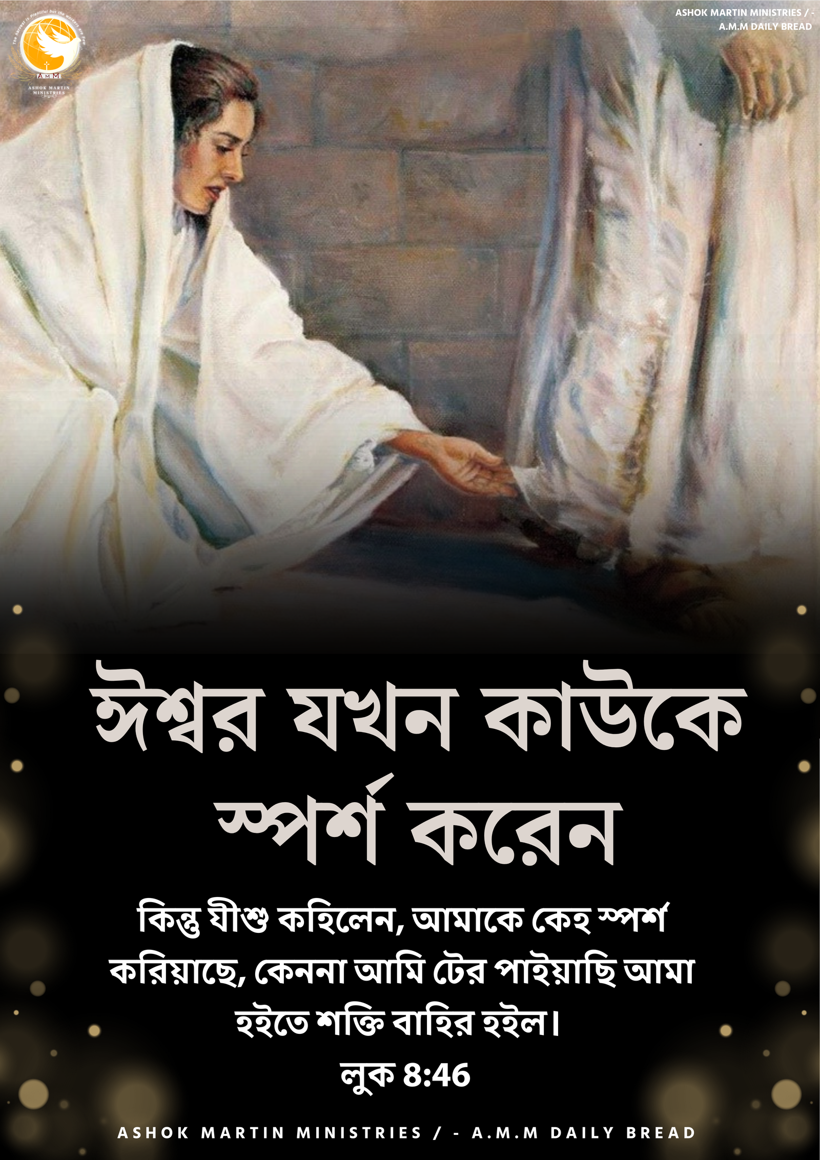 আপনি যদি ঈশ্বরের স্পর্শ চান, তাহলে এই মহিলার মতো করুন, যীশু যে প্রশ্নগুলি করেছিলেন তা শুনুন এবং আপনি কেন তাকে স্পর্শ করেছেন তা প্রকাশ্যে তাঁর কাছে স্বীকার করুন। আর এটাকে অপবিত্র করার চিন্তা করবেন না। তিনি পবিত্র এবং পবিত্রতা অপবিত্রতাকে জয় করে।