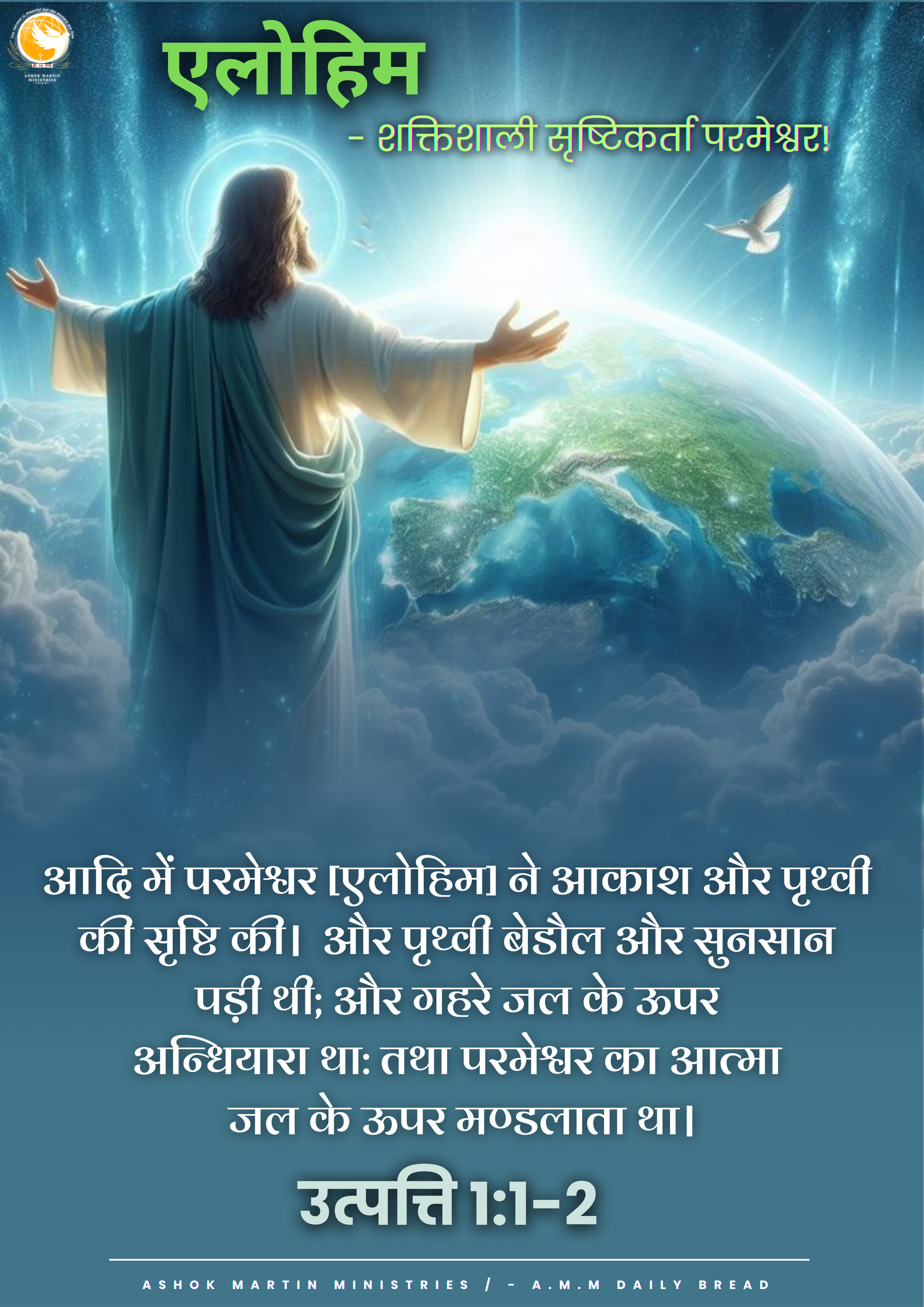 आदि में परमेश्वर [एलोहिम] ने आकाश और पृथ्वी की सृष्टि की। और पृथ्वी बेडौल और सुनसान पड़ी थी; और गहरे जल के ऊपर अन्धियारा था: तथा परमेश्वर का आत्मा जल के ऊपर मण्डलाता था। उत्पत्ति 1:1-2