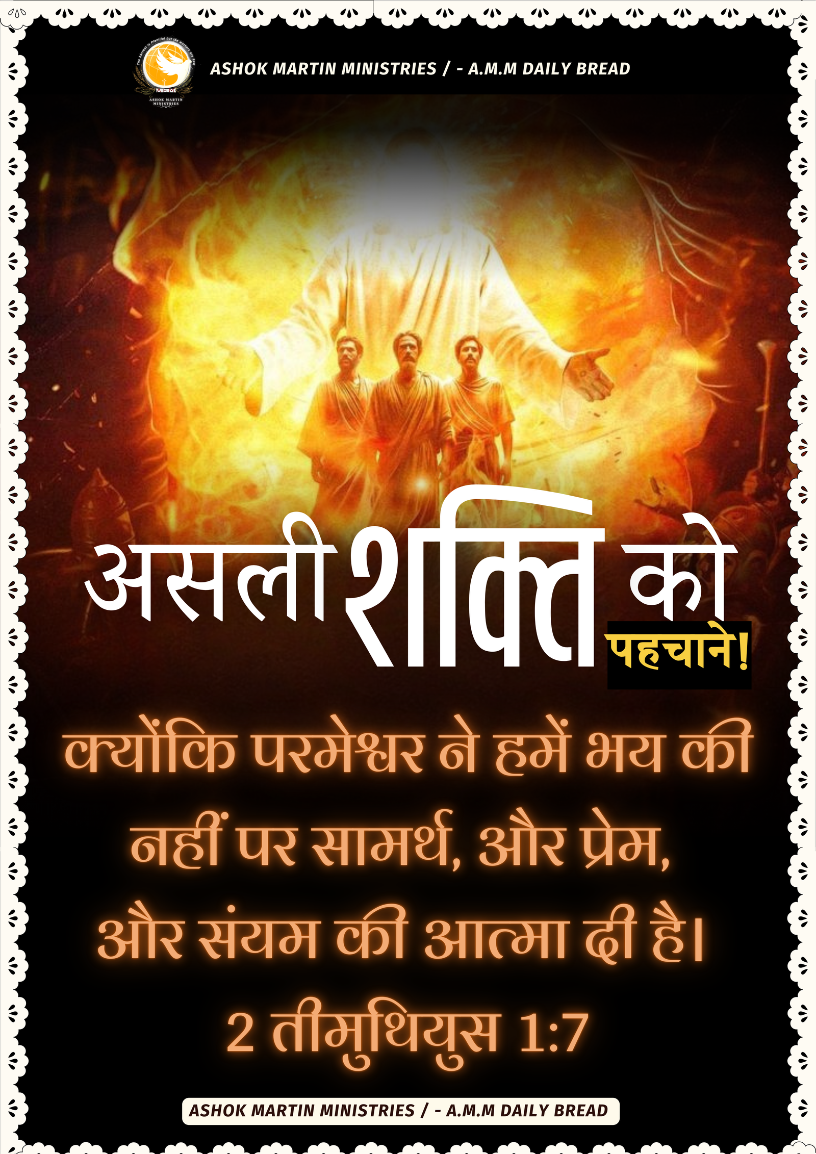 क्योंकि परमेश्वर ने हमें भय की नहीं पर सामर्थ, और प्रेम, और संयम की आत्मा दी है। 2 तीमुथियुस 1:7