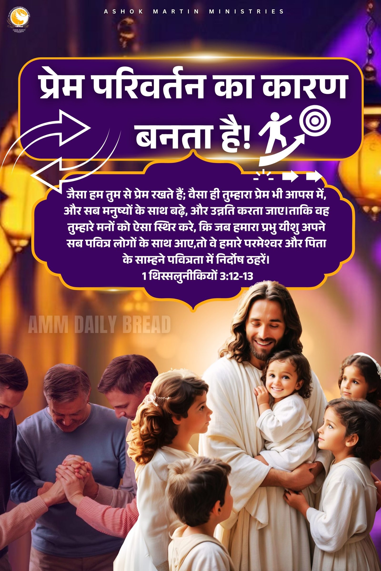 जैसा हम तुम से प्रेम रखते हैं; वैसा ही तुम्हारा प्रेम भी आपस में, और सब मनुष्यों के साथ बढ़े, और उन्नति करता जाए।ताकि वह तुम्हारे मनों को ऐसा स्थिर करे, कि जब हमारा प्रभु यीशु अपने सब पवित्र लोगों के साथ आए,तो वे हमारे परमेश्वर और पिता के साम्हने पवित्रता में निर्दोष ठहरें। 1 थिस्सलुनीकियों 3:12-13