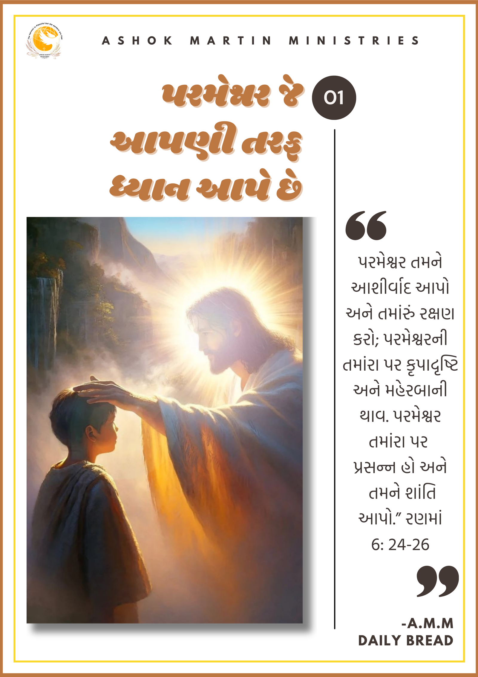 `પરમેશ્વર તમને આશીર્વાદ આપો અને તમાંરું રક્ષણ કરો; પરમેશ્વરની તમાંરા પર કૃપાદૃષ્ટિ અને મહેરબાની થાવ. પરમેશ્વર તમાંરા પર પ્રસન્ન હો અને તમને શાંતિ આપો.” રણમાં 6: 24-26`