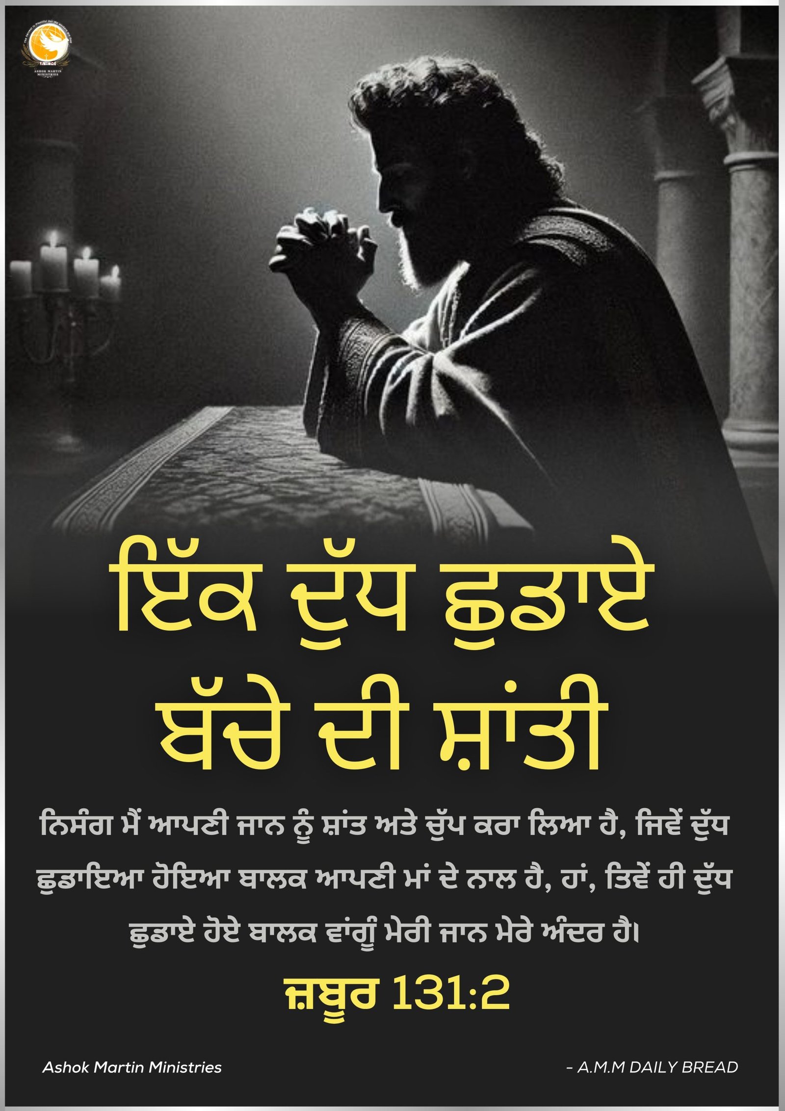 `ਨਿਸੰਗ ਮੈਂ ਆਪਣੀ ਜਾਨ ਨੂੰ ਸ਼ਾਂਤ ਅਤੇ ਚੁੱਪ ਕਰਾ ਲਿਆ ਹੈ, ਜਿਵੇਂ ਦੁੱਧ ਛੁਡਾਇਆ ਹੋਇਆ ਬਾਲਕ ਆਪਣੀ ਮਾਂ ਦੇ ਨਾਲ ਹੈ, ਹਾਂ, ਤਿਵੇਂ ਹੀ ਦੁੱਧ ਛੁਡਾਏ ਹੋਏ ਬਾਲਕ ਵਾਂਗੂੰ ਮੇਰੀ ਜਾਨ ਮੇਰੇ ਅੰਦਰ ਹੈ। ਜ਼ਬੂਰ 131:2`