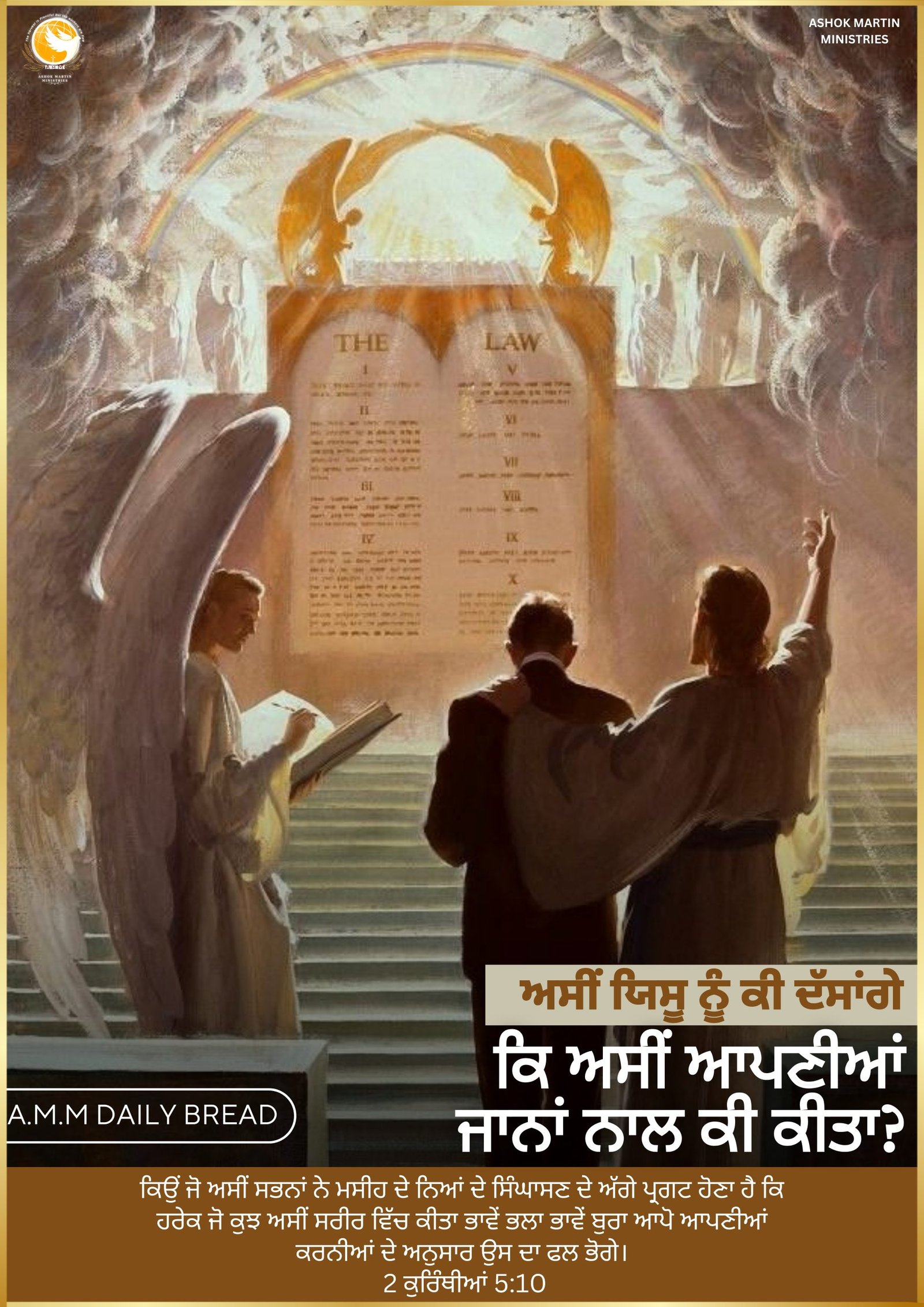 _`ਕਿਉਂ ਜੋ ਅਸੀਂ ਸਭਨਾਂ ਨੇ ਮਸੀਹ ਦੇ ਨਿਆਂ ਦੇ ਸਿੰਘਾਸਣ ਦੇ ਅੱਗੇ ਪ੍ਰਗਟ ਹੋਣਾ ਹੈ ਕਿ ਹਰੇਕ ਜੋ ਕੁਝ ਅਸੀਂ ਸਰੀਰ ਵਿੱਚ ਕੀਤਾ ਭਾਵੇਂ ਭਲਾ ਭਾਵੇਂ ਬੁਰਾ ਆਪੋ ਆਪਣੀਆਂ ਕਰਨੀਆਂ ਦੇ ਅਨੁਸਾਰ ਉਸ ਦਾ ਫਲ ਭੋਗੇ। 2 ਕੁਰਿੰਥੀਆਂ 5:10`_