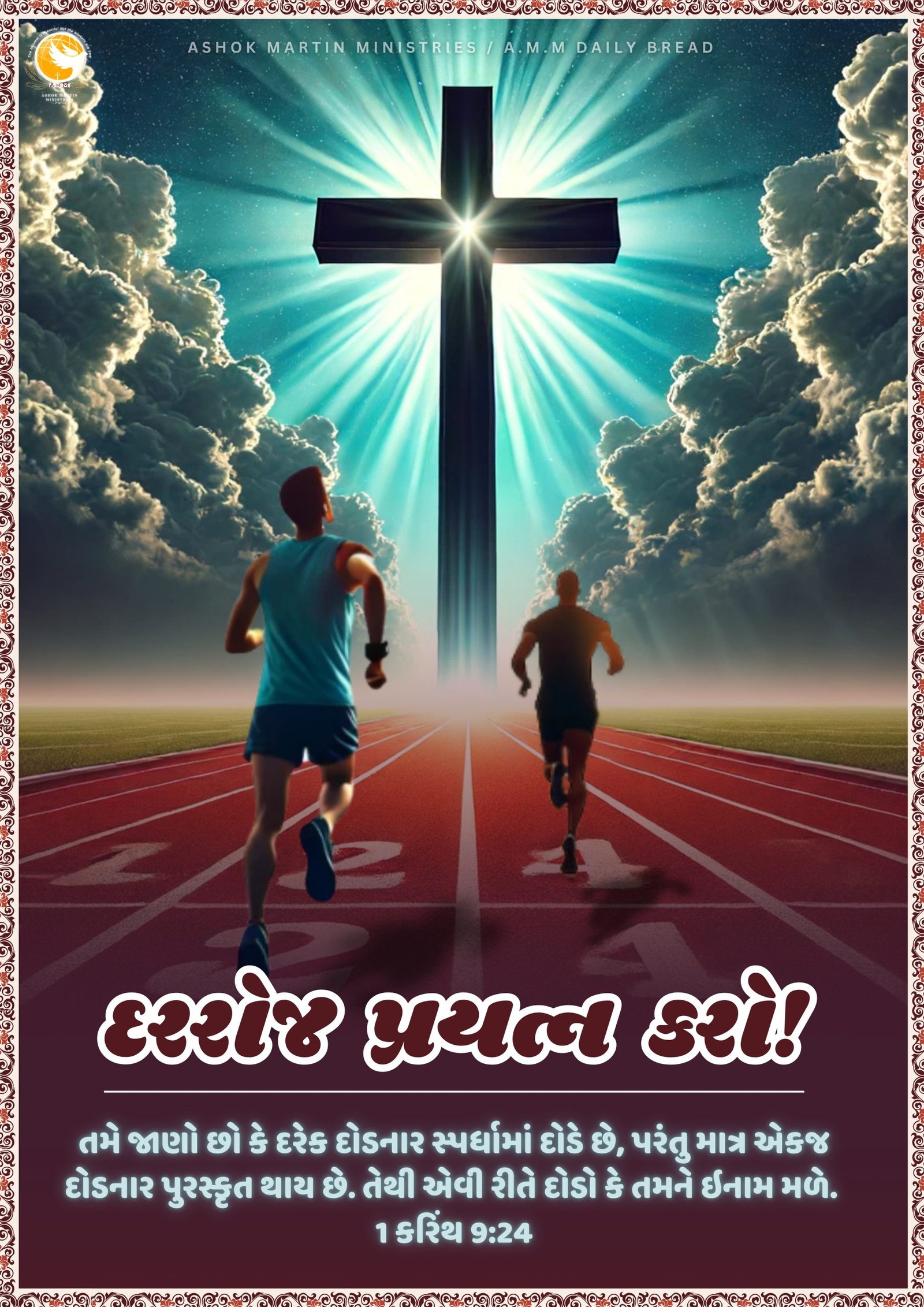 `તમે જાણો છો કે દરેક દોડનાર સ્પર્ધામાં દોડે છે, પરંતુ માત્ર એકજ દોડનાર પુરસ્કૃત થાય છે. તેથી એવી રીતે દોડો કે તમને ઇનામ મળે. 1 કરિંથ 9:24`