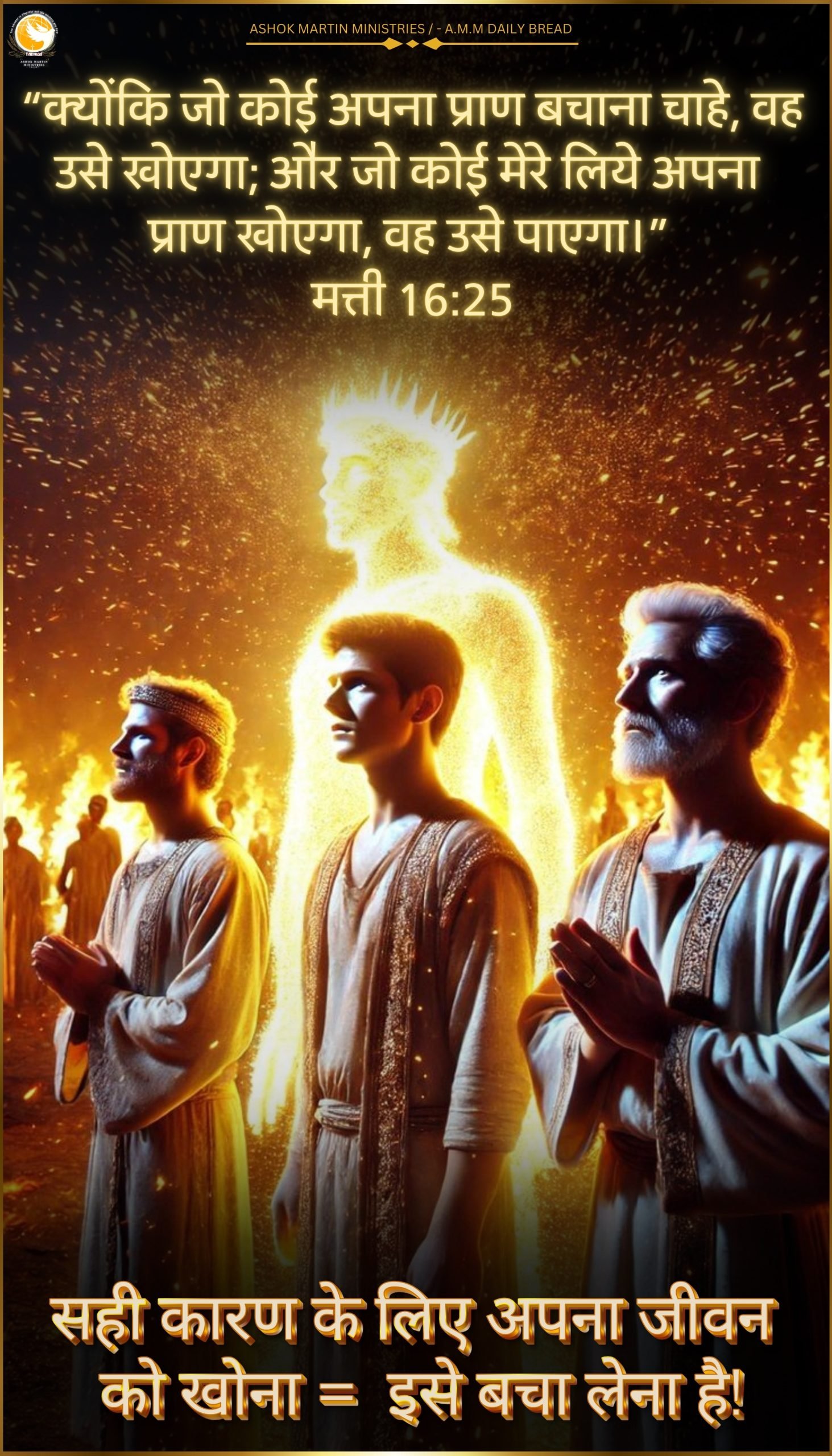याद कीजिए, इन लोगों को मौत की धमकी दी गई थी। उन्हें बताया गया था कि यदि वे राजा की खुदी हुई मूर्ति के सामने झुकेंगे नहीं तो उन्हें मार दिया जाएगा। और अब, नए नियम में यीशु भी यही बात कहते हैं। कि जिस क्षण आप खुद को नकारते हैं, जिस क्षण आप खुद को त्यागते हैं, जिस क्षण आप खुद को अस्वीकार करते हैं, जिस क्षण आप खुद को ईज़ेबेल के बहकावे से, दुनिया की व्यवस्थाओं की बहकाने वाली आत्माओं से अलग करते हैं, तब आप अपना क्रूस उठाएँगे। और जब आप अपना क्रूस उठाएँगे, तो आप अपना जीवन खो देंगे। आप अपने जीवन को यीशु के खातिर दे देंगे।