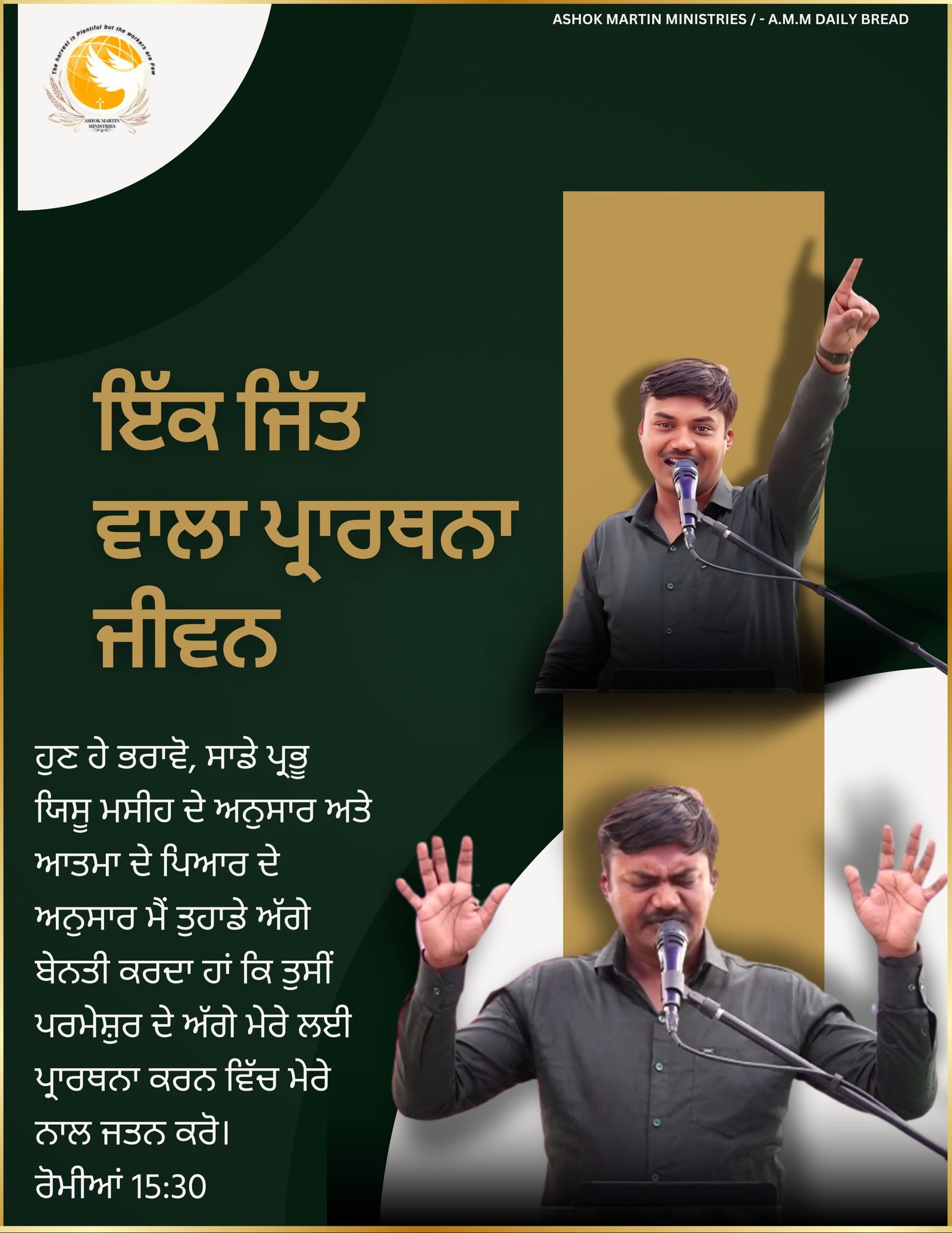 _`ਹੁਣ ਹੇ ਭਰਾਵੋ, ਸਾਡੇ ਪ੍ਰਭੂ ਯਿਸੂ ਮਸੀਹ ਦੇ ਅਨੁਸਾਰ ਅਤੇ ਆਤਮਾ ਦੇ ਪਿਆਰ ਦੇ ਅਨੁਸਾਰ ਮੈਂ ਤੁਹਾਡੇ ਅੱਗੇ ਬੇਨਤੀ ਕਰਦਾ ਹਾਂ ਕਿ ਤੁਸੀਂ ਪਰਮੇਸ਼ੁਰ ਦੇ ਅੱਗੇ ਮੇਰੇ ਲਈ ਪ੍ਰਾਰਥਨਾ ਕਰਨ ਵਿੱਚ ਮੇਰੇ ਨਾਲ ਜਤਨ ਕਰੋ। ਰੋਮੀਆਂ 15:30`_