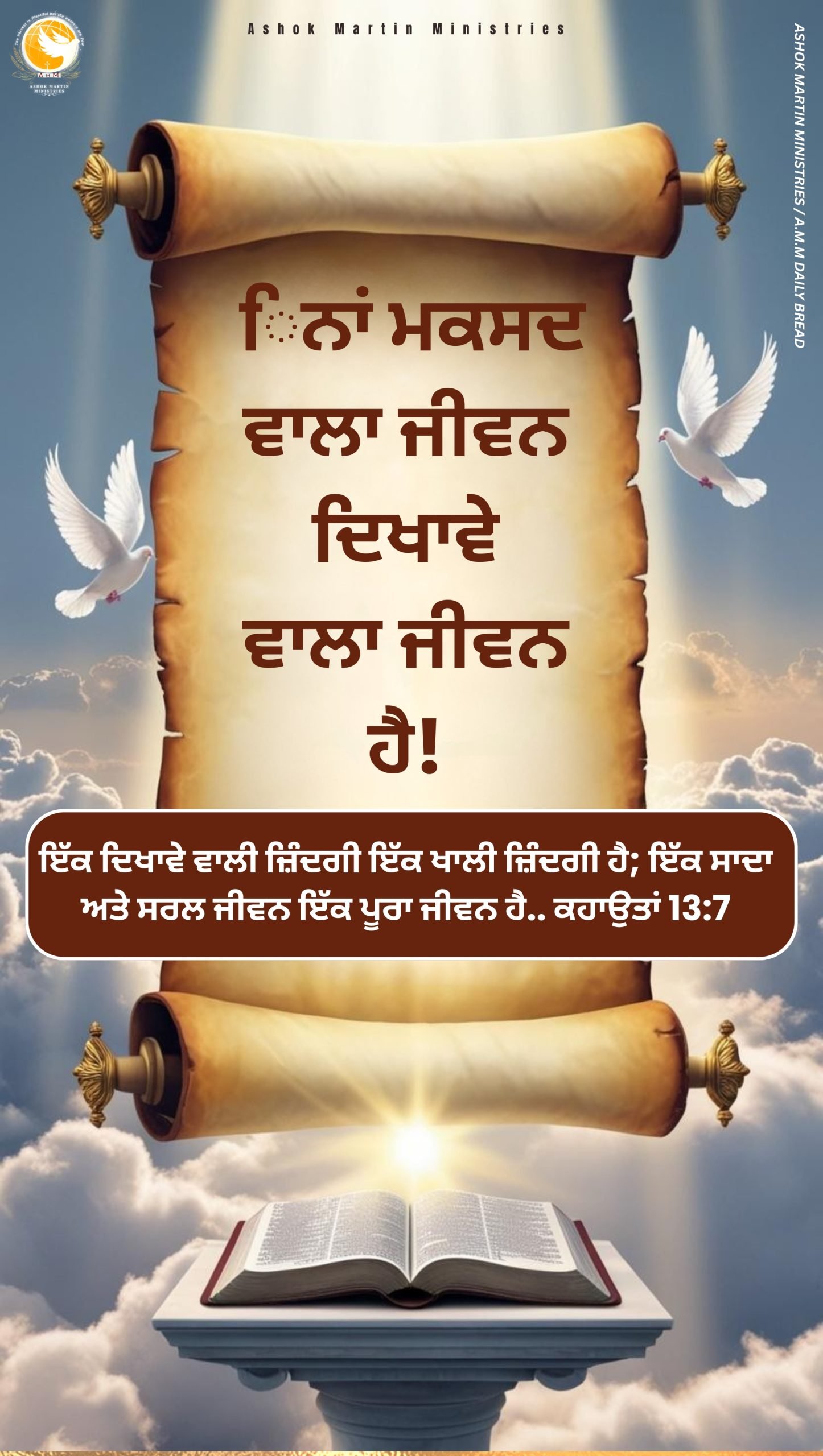 _`ਇੱਕ ਦਿਖਾਵੇ ਵਾਲੀ ਜ਼ਿੰਦਗੀ ਇੱਕ ਖਾਲੀ ਜ਼ਿੰਦਗੀ ਹੈ; ਇੱਕ ਸਾਦਾ ਅਤੇ ਸਰਲ ਜੀਵਨ ਇੱਕ ਪੂਰਾ ਜੀਵਨ ਹੈ.. ਕਹਾਉਤਾਂ 13:7`_