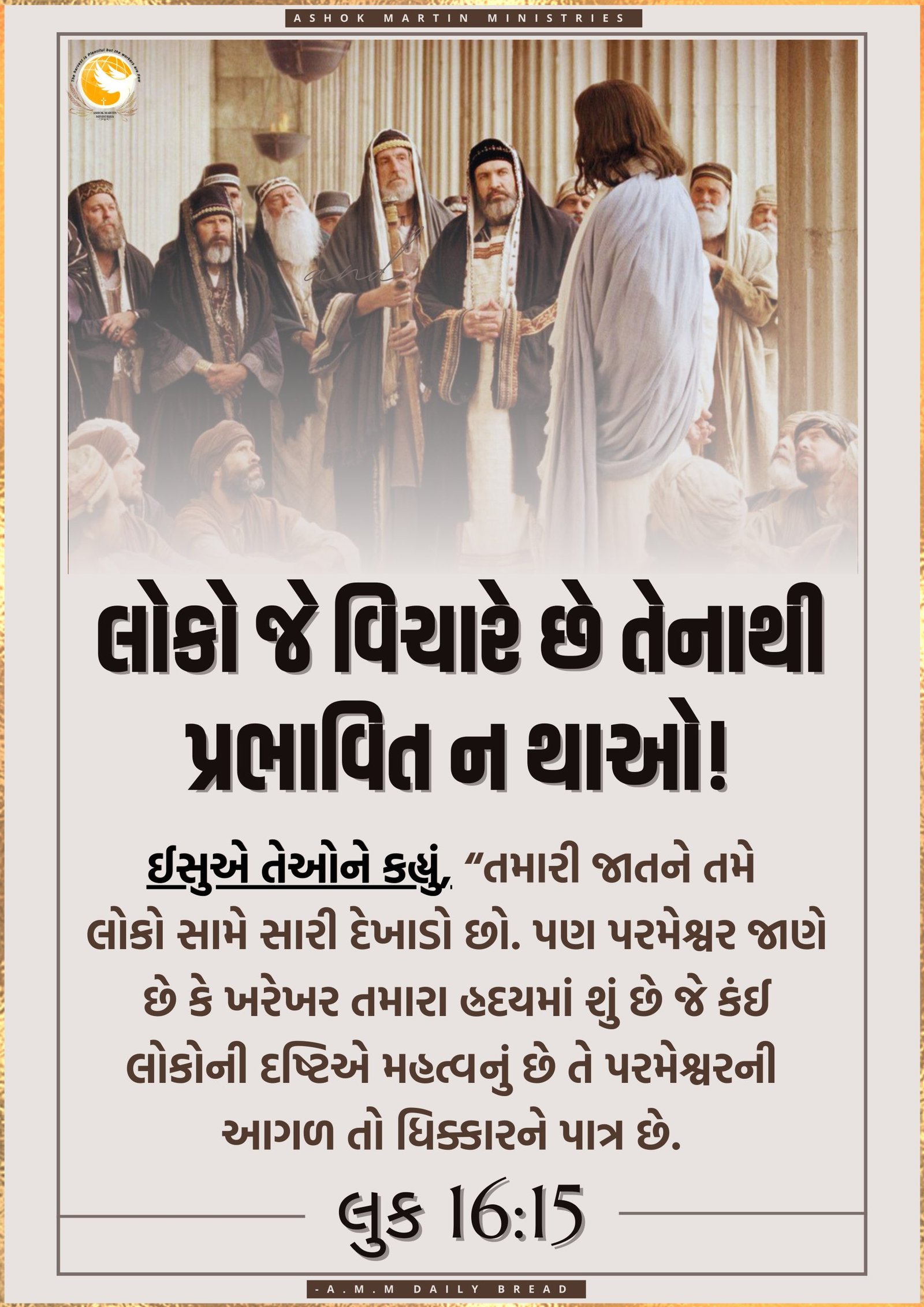 `ઈસુએ તેઓને કહ્યું, “તમારી જાતને તમે લોકો સામે સારી દેખાડો છો. પણ પરમેશ્વર જાણે છે કે ખરેખર તમારા હ્રદયમાં શું છે જે કંઈ લોકોની દષ્ટિએ મહત્વનું છે તે પરમેશ્વરની આગળ તો ધિક્કારને પાત્ર છે. લુક 16:15′