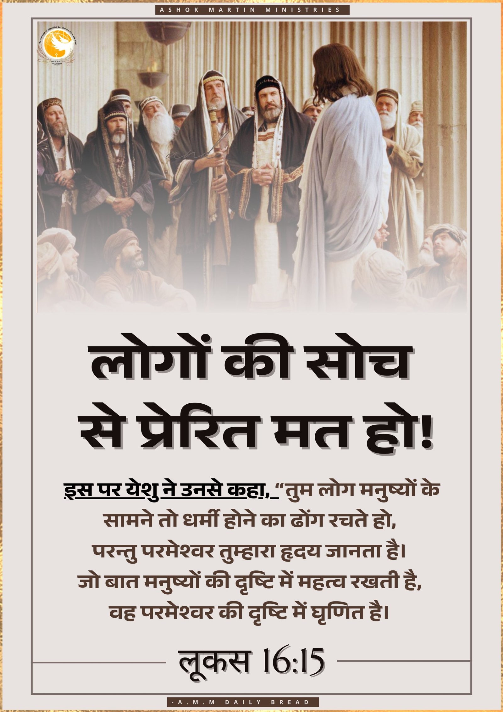 `इस पर येशु ने उनसे कहा, “तुम लोग मनुष्‍यों के सामने तो धर्मी होने का ढोंग रचते हो, परन्‍तु परमेश्‍वर तुम्‍हारा हृदय जानता है। जो बात मनुष्‍यों की दृष्‍टि में महत्व रखती है, वह परमेश्‍वर की दृष्‍टि में घृणित है। लूकस 16:15`