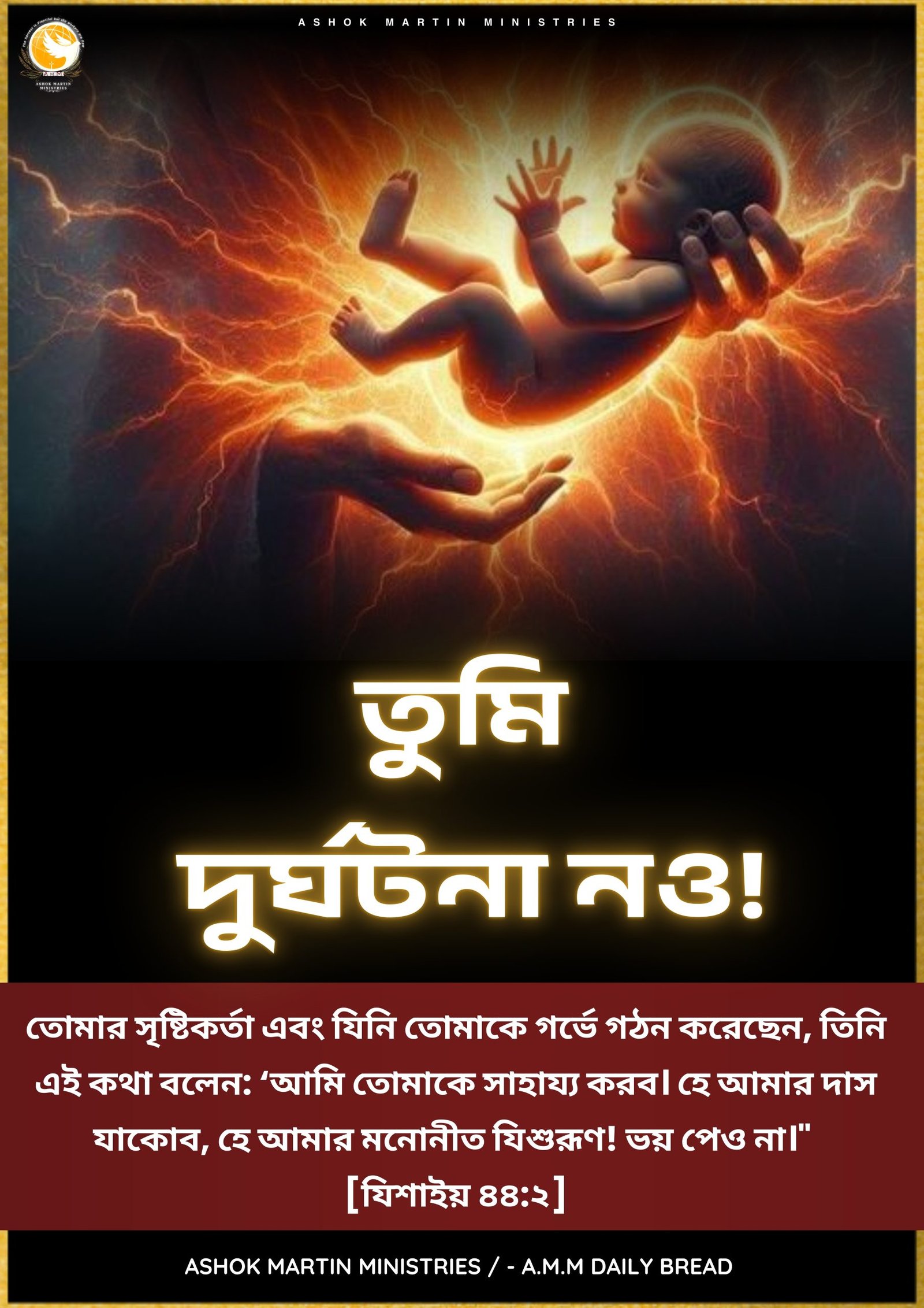 ‘তোমার সৃষ্টিকর্তা এবং যিনি তোমাকে গর্ভে গঠন করেছেন, তিনি এই কথা বলেন: ‘আমি তোমাকে সাহায্য করব। হে আমার দাস যাকোব, হে আমার মনোনীত যিশুরূণ! ভয় পেও না।” [যিশাইয় ৪৪:২]`