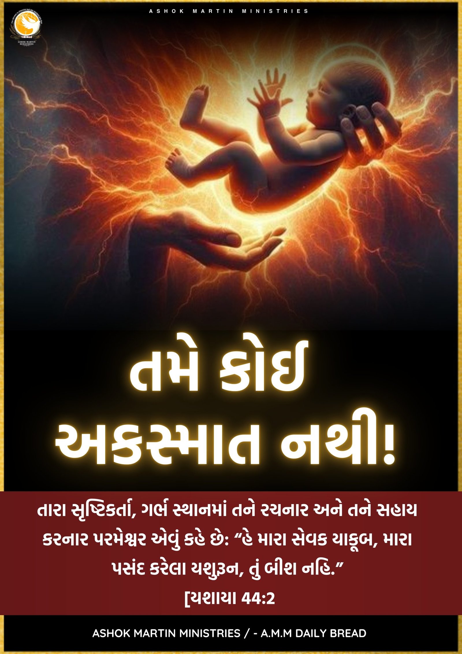 `તારા સૃષ્ટિકર્તા, ગર્ભસ્થાનમાં તને રચનાર અને તને સહાય કરનાર પરમેશ્વર એવું કહે છે: “હે મારા સેવક યાકૂબ, મારા પસંદ કરેલા યશુરૂન, તું બીશ નહિ.” [યશાયા 44:2(CEV) અનુસાર]`
