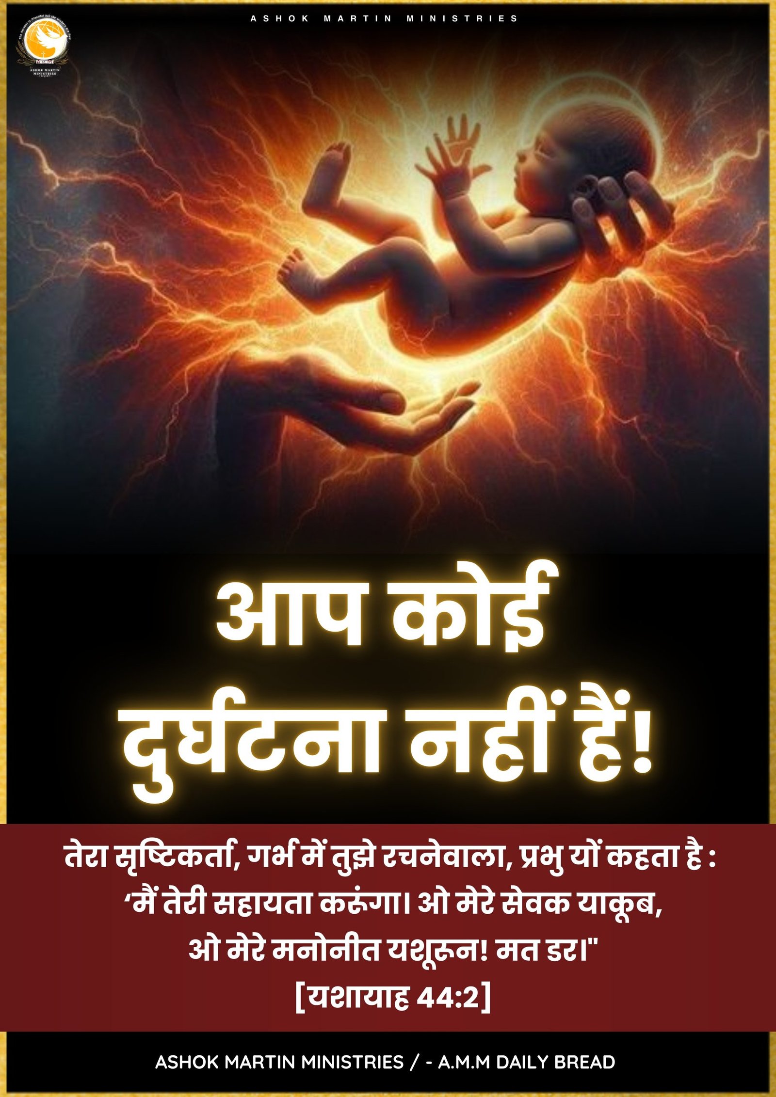 `तेरा सृष्टिकर्ता , गर्भ में तुझे रचनेवाला, प्रभु यों कहता है : ‘मैं तेरी सहायता करूंगा। ओ मेरे सेवक याकूब, ओ मेरे मनोनीत यशूरून! मत डर।” [यशायाह 44:2]`