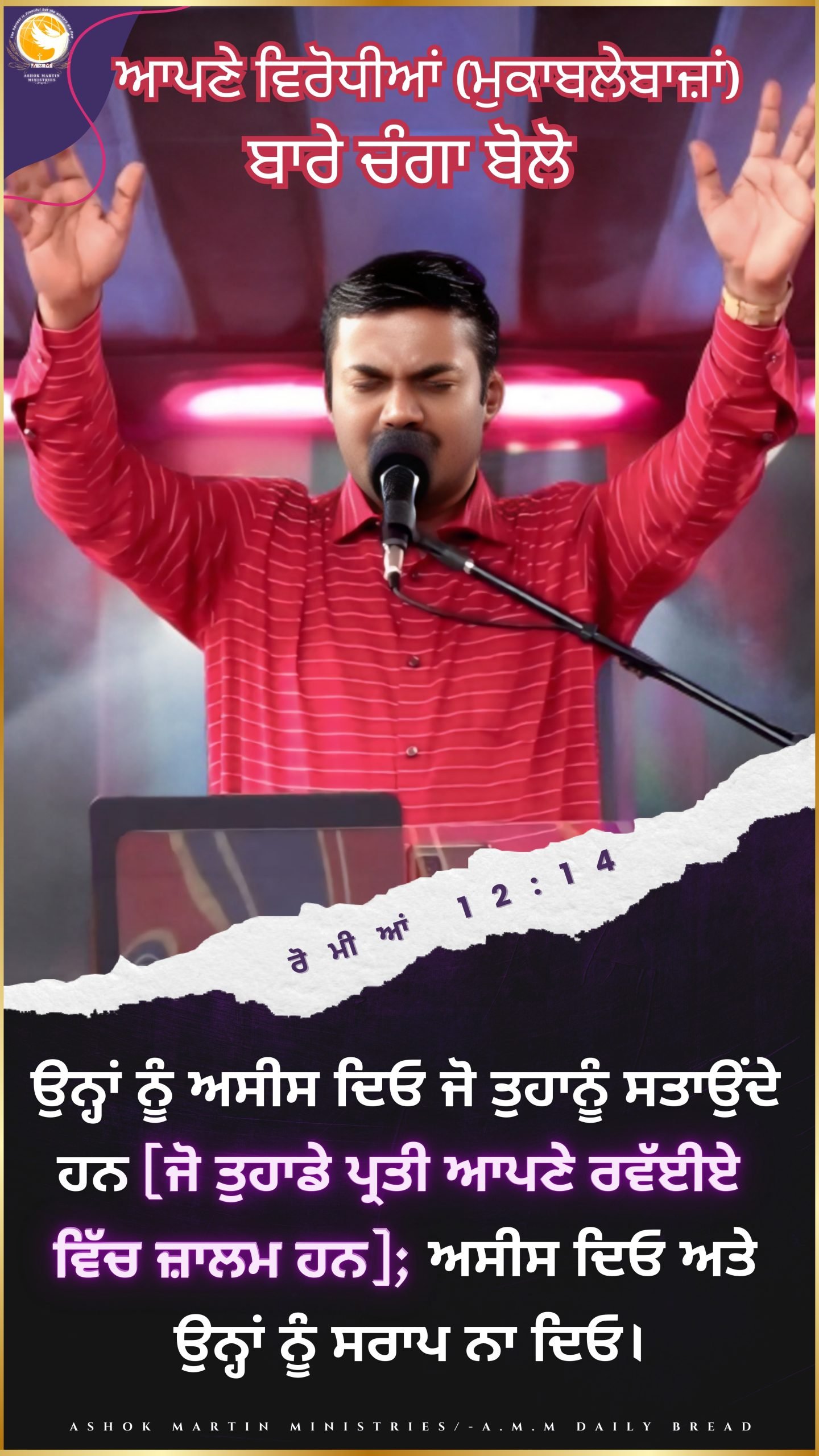 `ਉਨ੍ਹਾਂ ਨੂੰ ਅਸੀਸ ਦਿਓ ਜੋ ਤੁਹਾਨੂੰ ਸਤਾਉਂਦੇ ਹਨ [ਜੋ ਤੁਹਾਡੇ ਪ੍ਰਤੀ ਆਪਣੇ ਰਵੱਈਏ ਵਿੱਚ ਜ਼ਾਲਮ ਹਨ]; ਅਸੀਸ ਦਿਓ ਅਤੇ ਉਨ੍ਹਾਂ ਨੂੰ ਸਰਾਪ ਨਾ ਦਿਓ। ਰੋਮੀਆਂ 12:14`