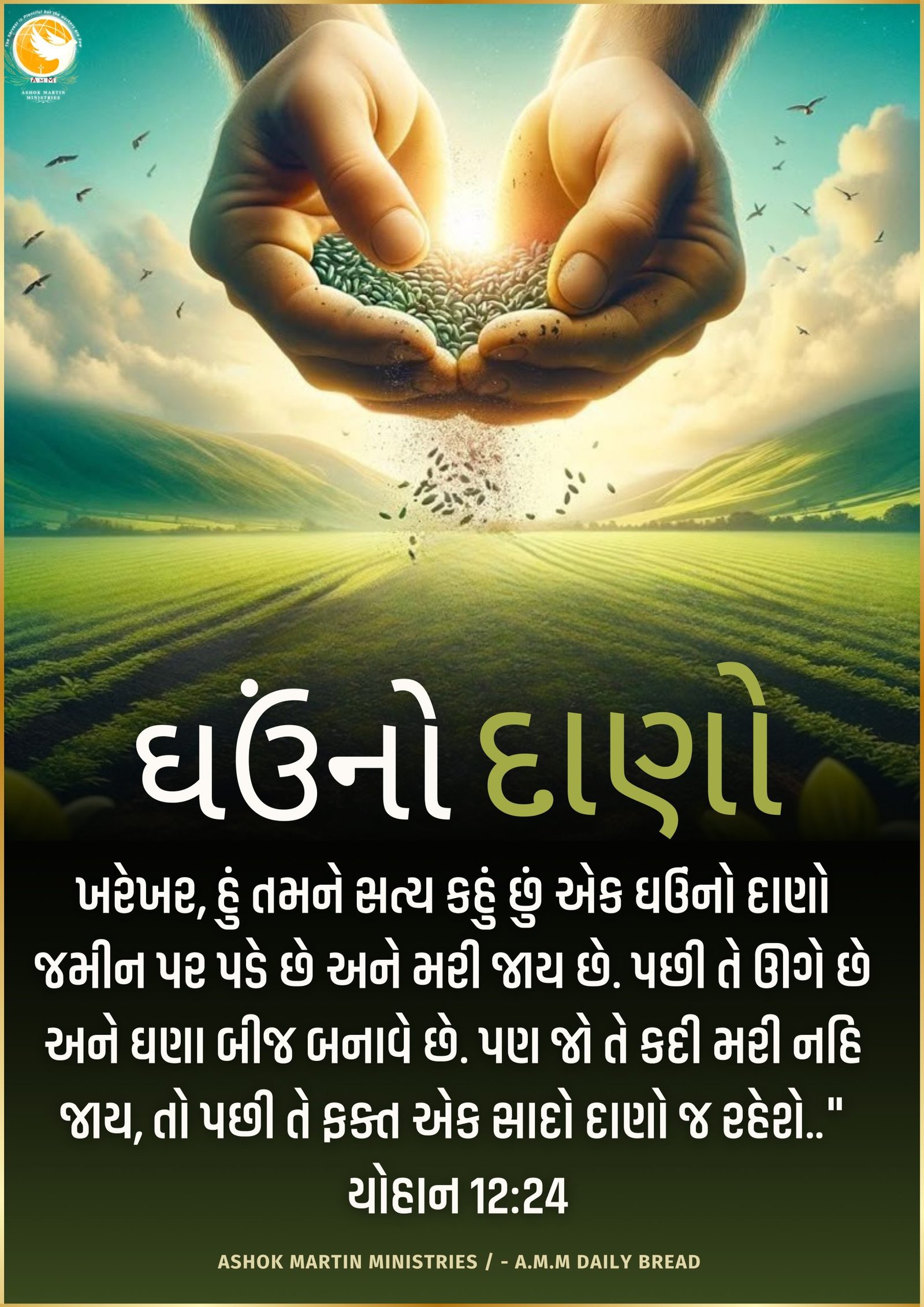 `ખરેખર, હું તમને સત્ય કહું છું એક ઘઉંનો દાણો જમીન પર પડે છે અને મરી જાય છે. પછી તે ઊગે છે અને ઘણા બીજ બનાવે છે. પણ જો તે કદી મરી નહિ જાય, તો પછી તે ફક્ત એક સાદો દાણો જ રહેશે..” યોહાન 12:24`