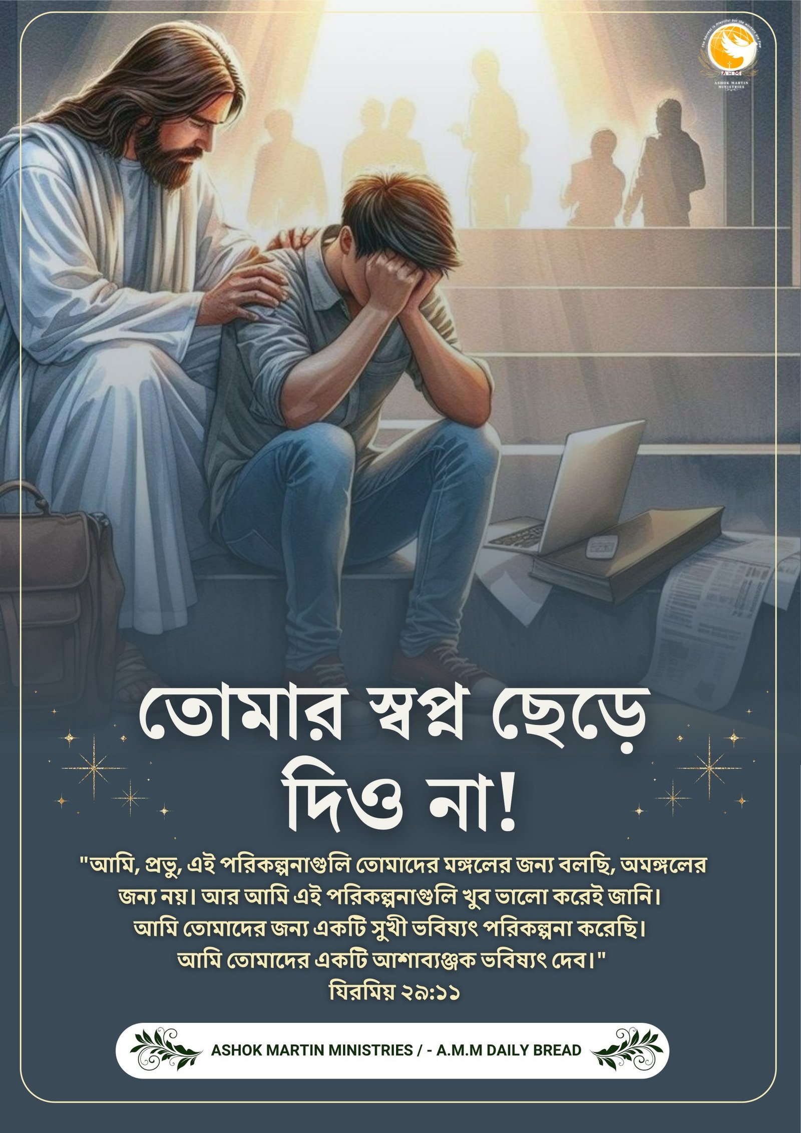 “আমি, প্রভু, এই পরিকল্পনাগুলি তোমাদের মঙ্গলের জন্য বলছি, অমঙ্গলের জন্য নয়। আর আমি এই পরিকল্পনাগুলি খুব ভালো করেই জানি। আমি তোমাদের জন্য একটি সুখী ভবিষ্যৎ পরিকল্পনা করেছি। আমি তোমাদের একটি আশাব্যঞ্জক ভবিষ্যৎ দেব।” যিরমিয় ২৯:১১