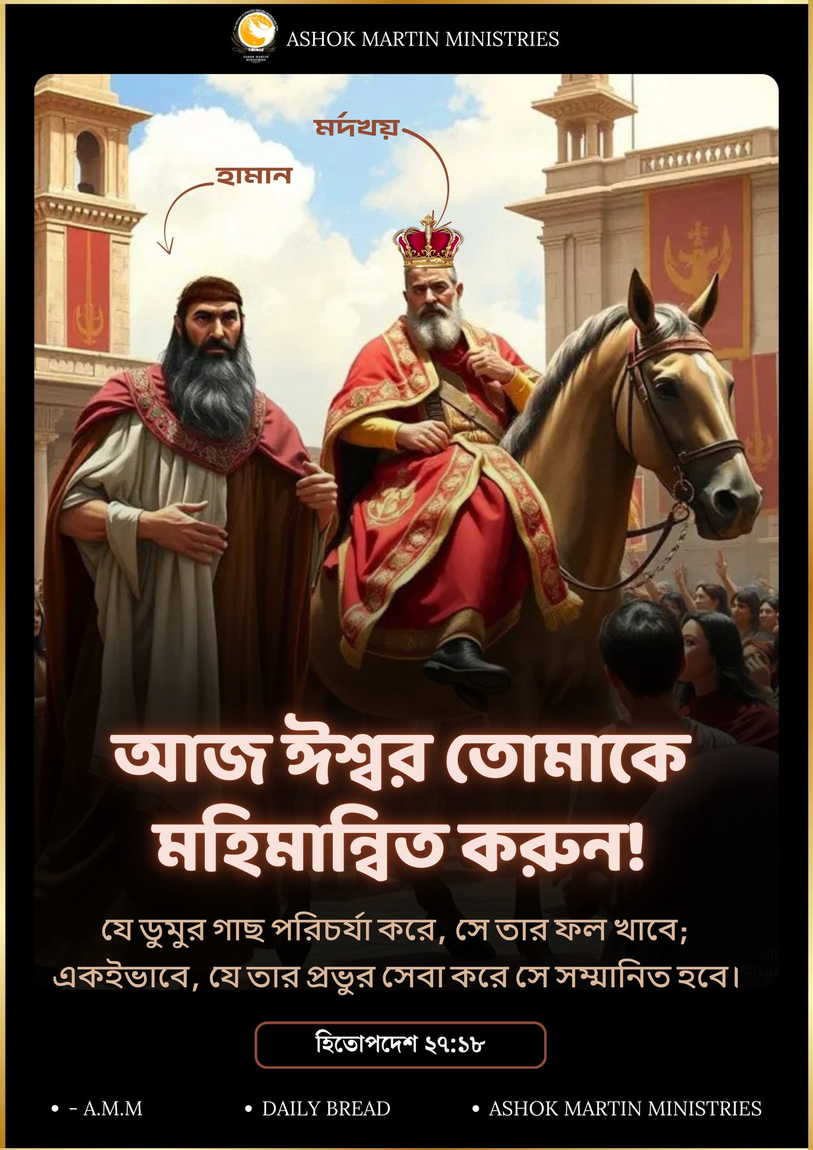 লোকেরা আপনার সাথে যেভাবে আচরণ করে তা আপনার সম্মানের অংশ। ঈশ্বর আজ তোমাকে মহিমান্বিত করুন! প্রার্থনা কখনো তোমাকে ধ্বংস করে না, বরং তোমাকে গড়ে তোলে। সম্মান মানে স্বীকৃতি, দক্ষতা, প্রচেষ্টা, ক্ষমতা, উপহার ইত্যাদি। ইষ্টের ৬:৩ পদে মর্দখয় রাজার জীবন বাঁচানোর চেষ্টা করেছিলেন, কিন্তু তার প্রচেষ্টা স্বীকৃতি পায়নি যতক্ষণ না একদিন রাজা জিজ্ঞাসা করেন, এর জন্য মর্দখয়কে কী সম্মান এবং মর্যাদা দেওয়া হয়েছে? এবং মর্দখয়ের প্রচেষ্টা স্মরণ করা হয়েছিল এবং সম্মানিত করা হয়েছিল!