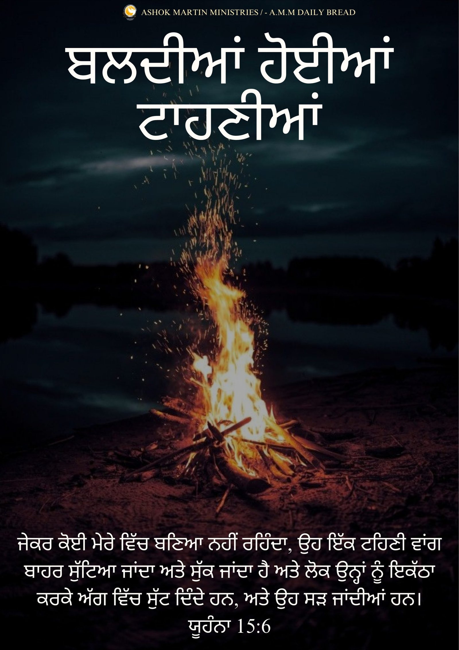 _`ਜੇਕਰ ਕੋਈ ਮੇਰੇ ਵਿੱਚ ਬਣਿਆ ਨਹੀਂ ਰਹਿੰਦਾ, ਉਹ ਇੱਕ ਟਹਿਣੀ ਵਾਂਗ ਬਾਹਰ ਸੁੱਟਿਆ ਜਾਂਦਾ ਅਤੇ ਸੁੱਕ ਜਾਂਦਾ ਹੈ ਅਤੇ ਲੋਕ ਉਨ੍ਹਾਂ ਨੂੰ ਇਕੱਠਾ ਕਰਕੇ ਅੱਗ ਵਿੱਚ ਸੁੱਟ ਦਿੰਦੇ ਹਨ, ਅਤੇ ਉਹ ਸੜ ਜਾਂਦੀਆਂ ਹਨ। ਯੂਹੰਨਾ 15:6`_
