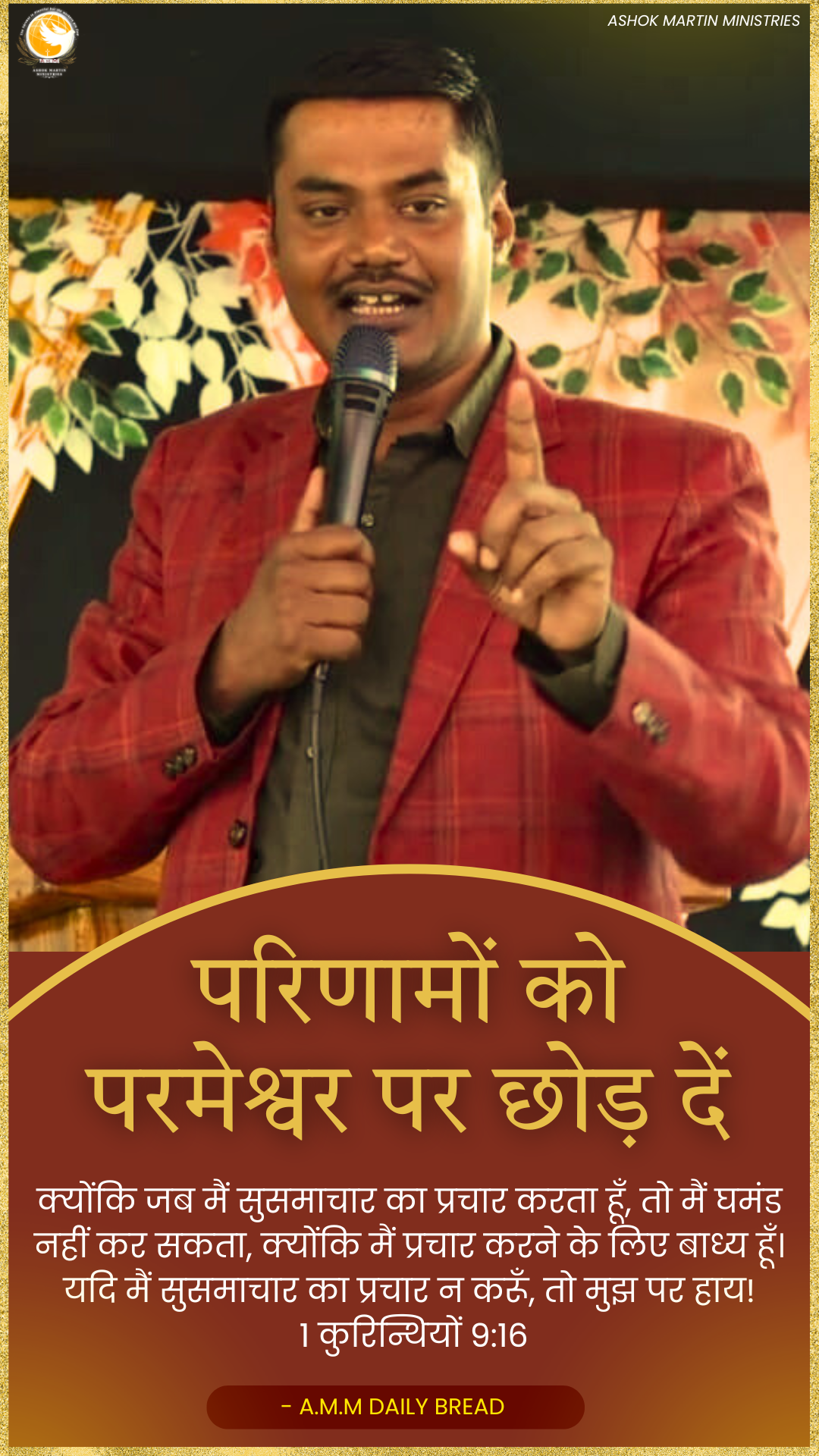*परिणामों को परमेश्वर पर छोड़ दें* `क्योंकि जब मैं सुसमाचार का प्रचार करता हूँ, तो मैं घमंड नहीं कर सकता, क्योंकि मैं प्रचार करने के लिए बाध्य हूँ। यदि मैं सुसमाचार का प्रचार न करूँ, तो मुझ पर हाय! 1 कुरिन्थियों 9:16` परमेश्वर के वचन के सेवक अक्सर आश्चर्य करते हैं कि उनके उपदेश या शिक्षा देने के बाद उनके शब्दों का कैसा प्रभाव पड़ता है। यह जानना बिल्कुल सामान्य है कि आपने किस तरह का प्रभाव डाला है। लेकिन अधिकांश प्रचारक, इसके बारे में बहुत अधिक चिंतित रहते हैं। मुझे यकीन है कि आप इन सवालों से परिचित हैं: “कौन प्रभावित हुआ? कौन छुआ गया? कौन प्रकाशित हुआ? कितनों का मन परिवर्तन हुआ? कितने लोग वास्तव में यीशु की ओर मुड़े?” लेकिन एक बात जान लें: आप कभी भी अपने प्रभाव की पूरी सीमा नहीं जान पाएंगे। परमेश्वर के राज्य के रहस्यों में से एक यह है कि मनुष्य इसका विरोध कर सकते हैं। हालाँकि राज्य सभी के लिए उपलब्ध है, लेकिन यह किसी को भी पछाड़ या पराजित नहीं करता है जो इसे प्राप्त करने से इनकार करता है। अमीर युवा शासक के साथ यीशु का आदान-प्रदान इस बात का एक उदाहरण है कि कैसे प्रभु ने परिणामों को जाने दिया। दिलचस्प बात यह है कि हमें बताया गया है कि यीशु को युवा शासक से एक विशेष प्रकार का स्नेह था। सुसमाचार हमें बताता है, _”यीशु ने उससे प्रेम से देखा,”_ जो एक असामान्य वर्णन है। यीशु ने उसे देखा और उससे प्रेम किया। मार्क 10:21 शायद प्रभु ने पहले ही देख लिया था कि उस युवा को उन सत्तर लोगों में से एक बनने के लिए बुलाया जाएगा जिन्हें वह बाद में भेजेगा। शायद उसने महसूस किया कि युवा शासक को यरूशलेम में जल्द ही जन्म लेने वाले पहले कलीसिया में एक स्तंभ बनने के लिए नियत किया गया था। हम नहीं जानते, लेकिन इस व्यक्ति के बारे में कुछ खास बात ने यीशु को अद्वितीय स्नेह दिया। जब उस व्यक्ति ने सब कुछ बेचकर उसका अनुसरण करने की प्रभु की चुनौती का विरोध किया, तो यीशु ने उसका पीछा नहीं किया। उसने उसे उसके गलत निर्णय के बारे में समझाने की कोशिश नहीं की। उसने उसे परेशान नहीं किया या उसे राज्य में जाने के लिए डराने की कोशिश नहीं की। यीशु ने उसे जाने दिया, और परिणाम को अपने पिता पर छोड़ दिया। इसलिए इस पर ध्यान केंद्रित करना एक गलती है। सेवा करने के बाद, बस आराम करें और परिणाम को परमेश्वर पर छोड़ दें। हालाँकि कभी-कभी प्रभु आपको आपकी सेवकाई के फल की एक छोटी सी झलक दिखाएंगे, लेकिन ज़्यादातर समय ऐसा नहीं होगा। बस, परिणाम परमेश्वर पर छोड़ दें! मसीह में आपका भाई, प्रेरित अशोक मार्टिन