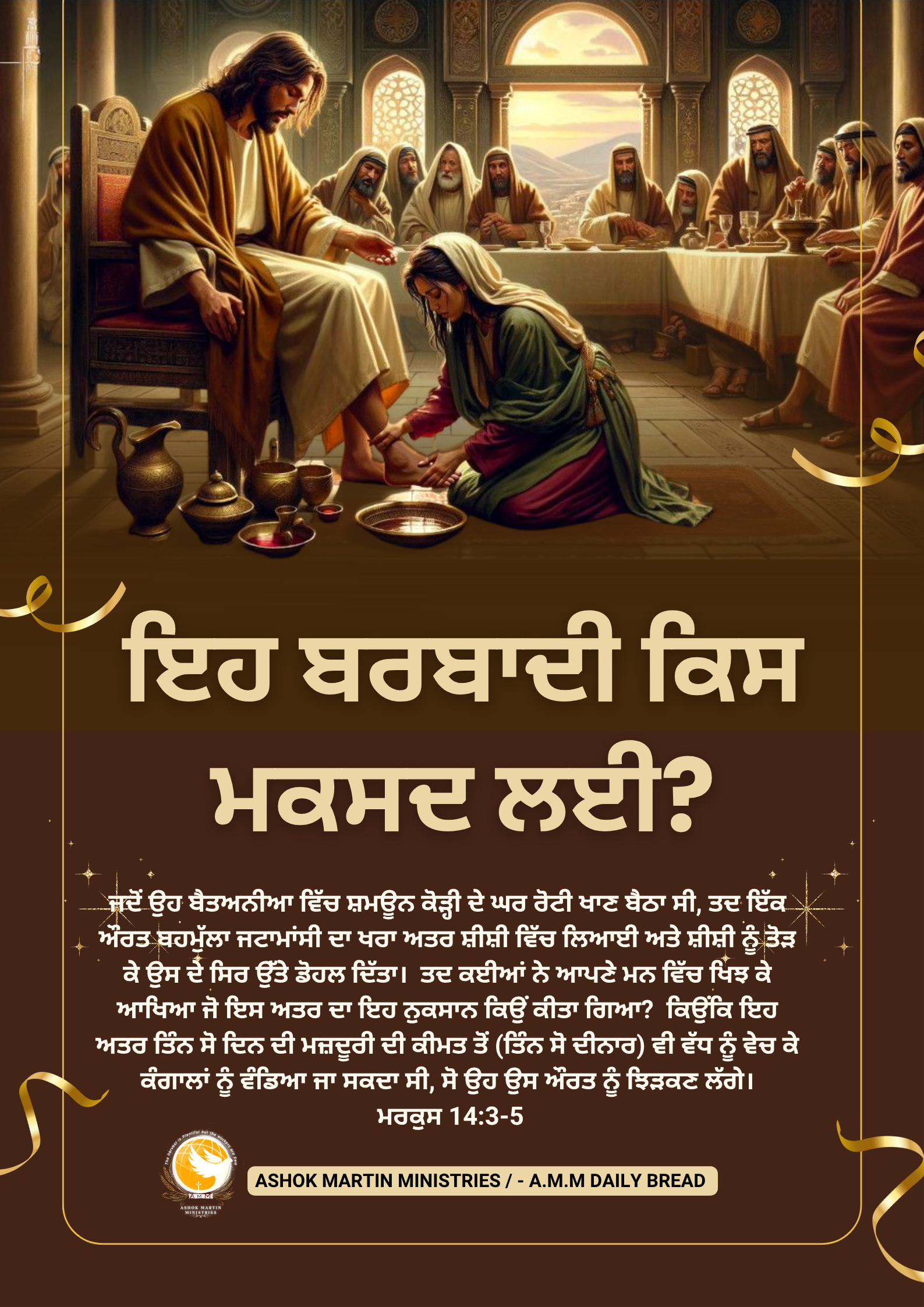 _`ਜਦੋਂ ਉਹ ਬੈਤਅਨੀਆ ਵਿੱਚ ਸ਼ਮਊਨ ਕੋੜ੍ਹੀ ਦੇ ਘਰ ਰੋਟੀ ਖਾਣ ਬੈਠਾ ਸੀ, ਤਦ ਇੱਕ ਔਰਤ ਬਹਮੁੱਲਾ ਜਟਾਮਾਂਸੀ ਦਾ ਖਰਾ ਅਤਰ ਸ਼ੀਸ਼ੀ ਵਿੱਚ ਲਿਆਈ ਅਤੇ ਸ਼ੀਸ਼ੀ ਨੂੰ ਤੋੜ ਕੇ ਉਸ ਦੇ ਸਿਰ ਉੱਤੇ ਡੋਹਲ ਦਿੱਤਾ। ਤਦ ਕਈਆਂ ਨੇ ਆਪਣੇ ਮਨ ਵਿੱਚ ਖਿਝ ਕੇ ਆਖਿਆ ਜੋ ਇਸ ਅਤਰ ਦਾ ਇਹ ਨੁਕਸਾਨ ਕਿਉਂ ਕੀਤਾ ਗਿਆ? ਕਿਉਂਕਿ ਇਹ ਅਤਰ ਤਿੰਨ ਸੋ ਦਿਨ ਦੀ ਮਜ਼ਦੂਰੀ ਦੀ ਕੀਮਤ ਤੋਂ (ਤਿੰਨ ਸੋ ਦੀਨਾਰ) ਵੀ ਵੱਧ ਨੂੰ ਵੇਚ ਕੇ ਕੰਗਾਲਾਂ ਨੂੰ ਵੰਡਿਆ ਜਾ ਸਕਦਾ ਸੀ, ਸੋ ਉਹ ਉਸ ਔਰਤ ਨੂੰ ਝਿੜਕਣ ਲੱਗੇ। ਮਰਕੁਸ 14:3-5`_